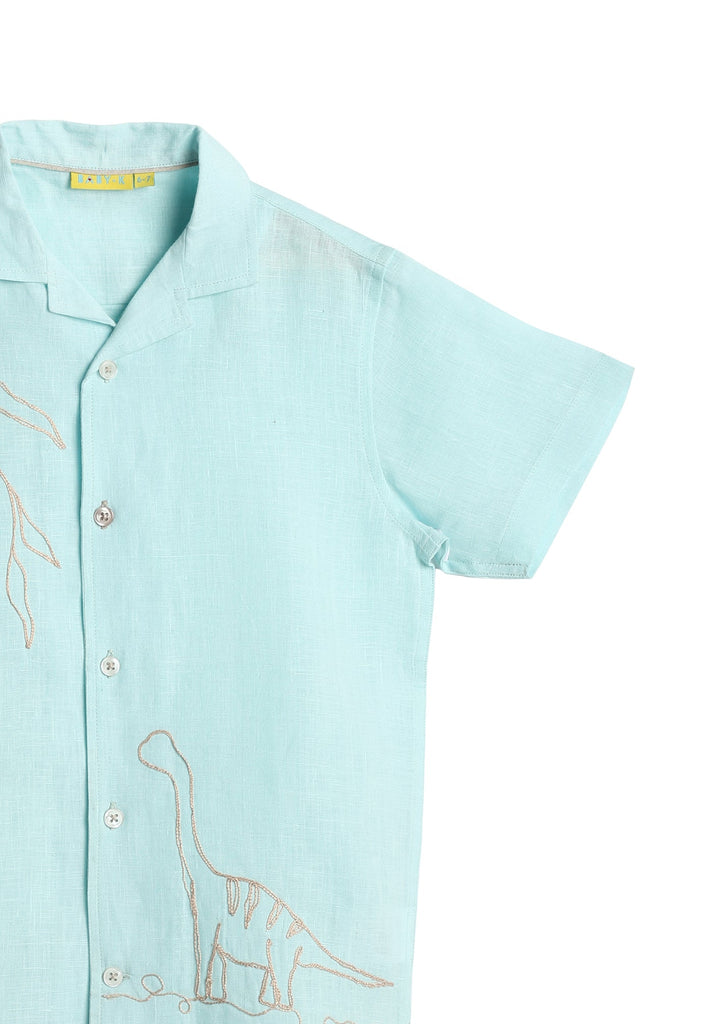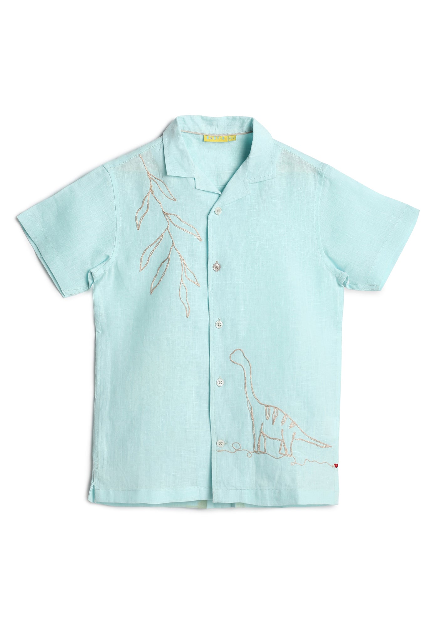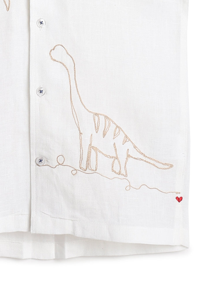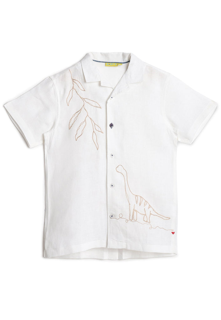 Half sleeve regular collar shirt with a cool dino and jungle leaf embroidery. Paired with essential linen pants.