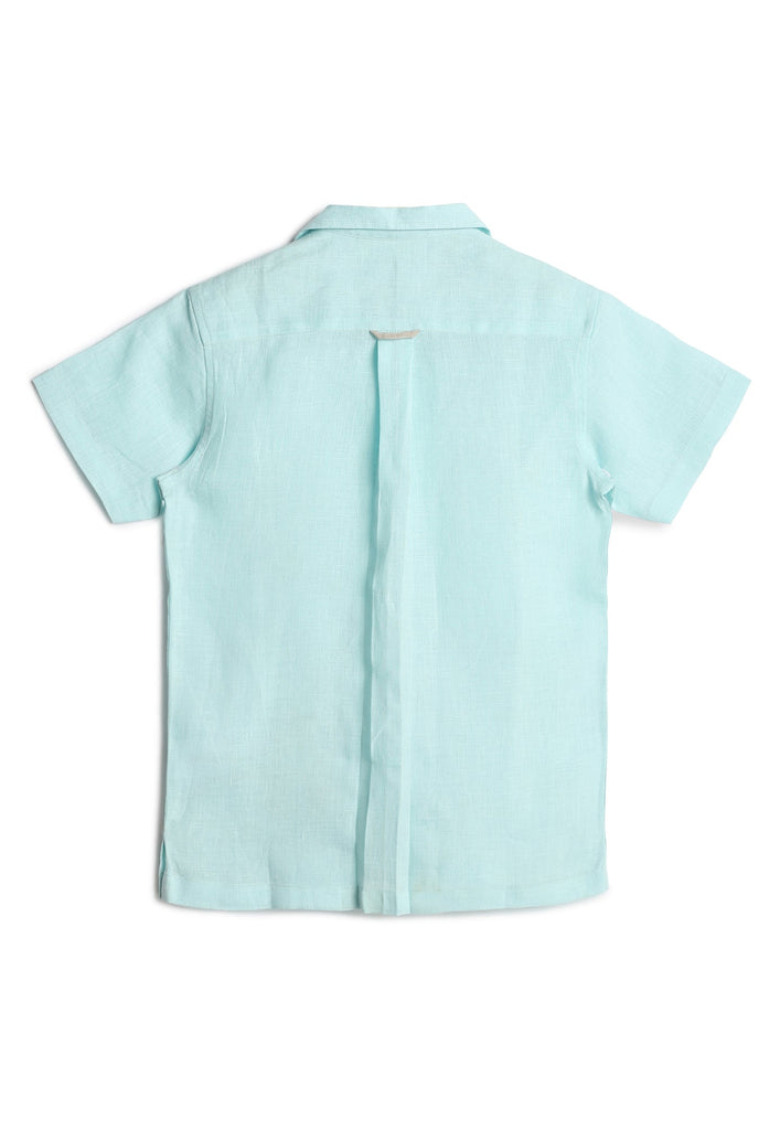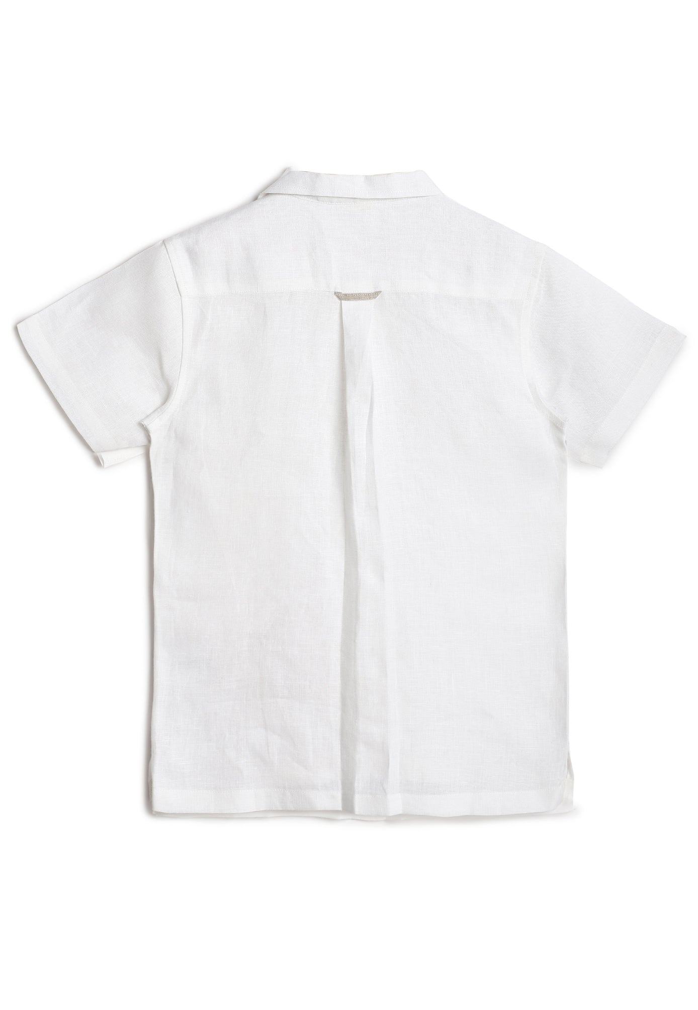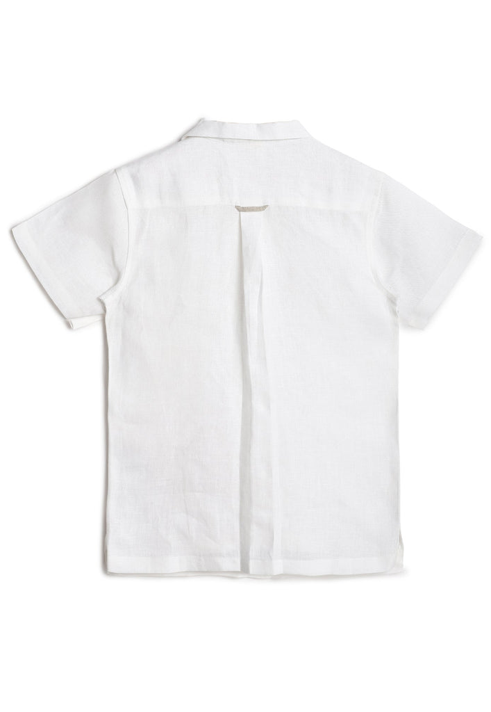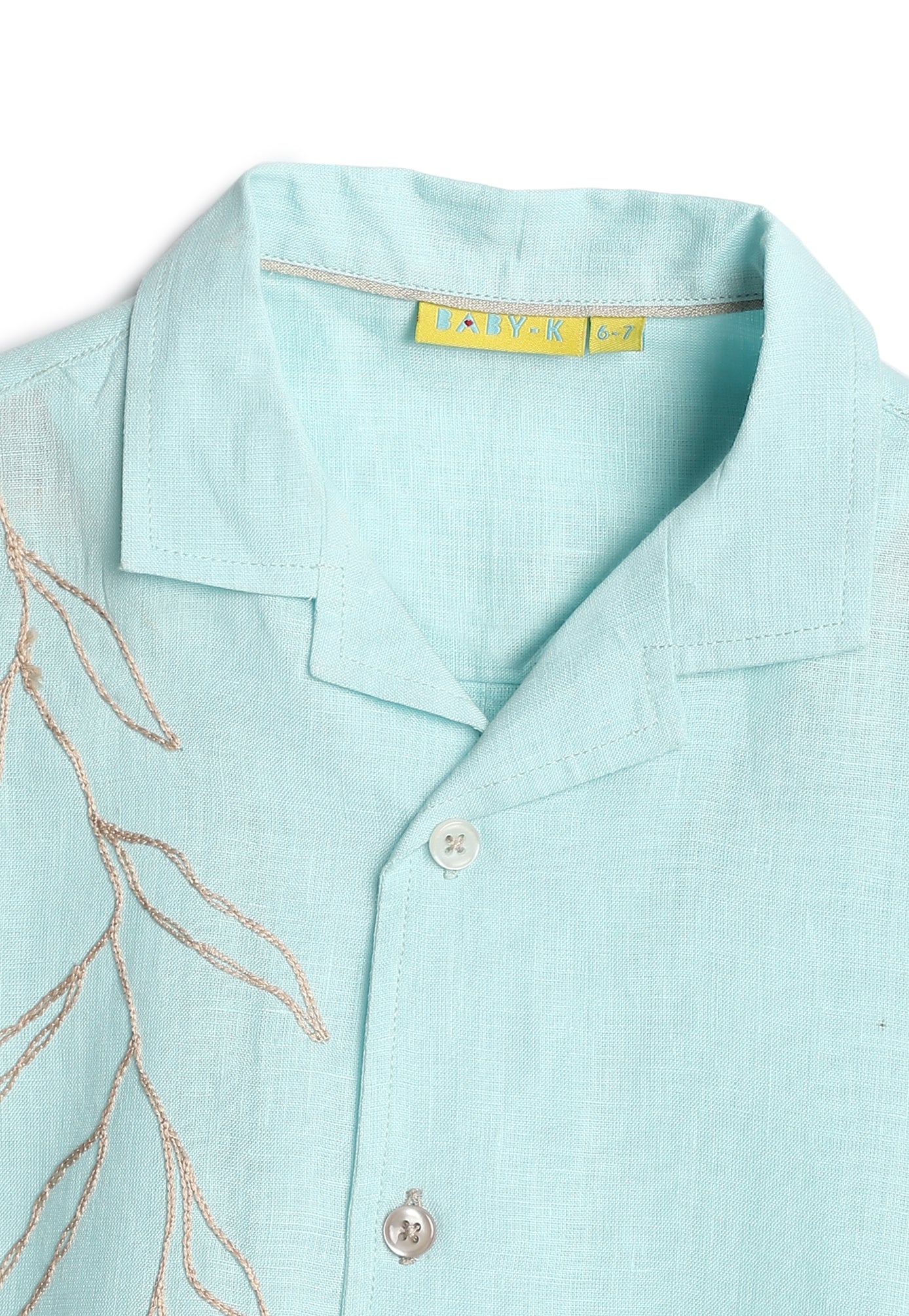 Half sleeve regular collar shirt with a cool dino and jungle leaf embroidery. Paired with essential linen pants.