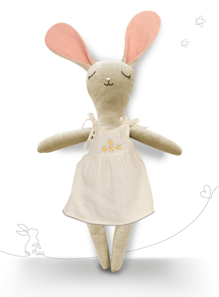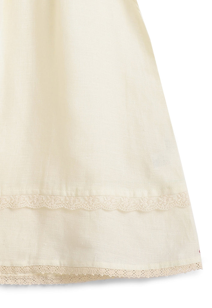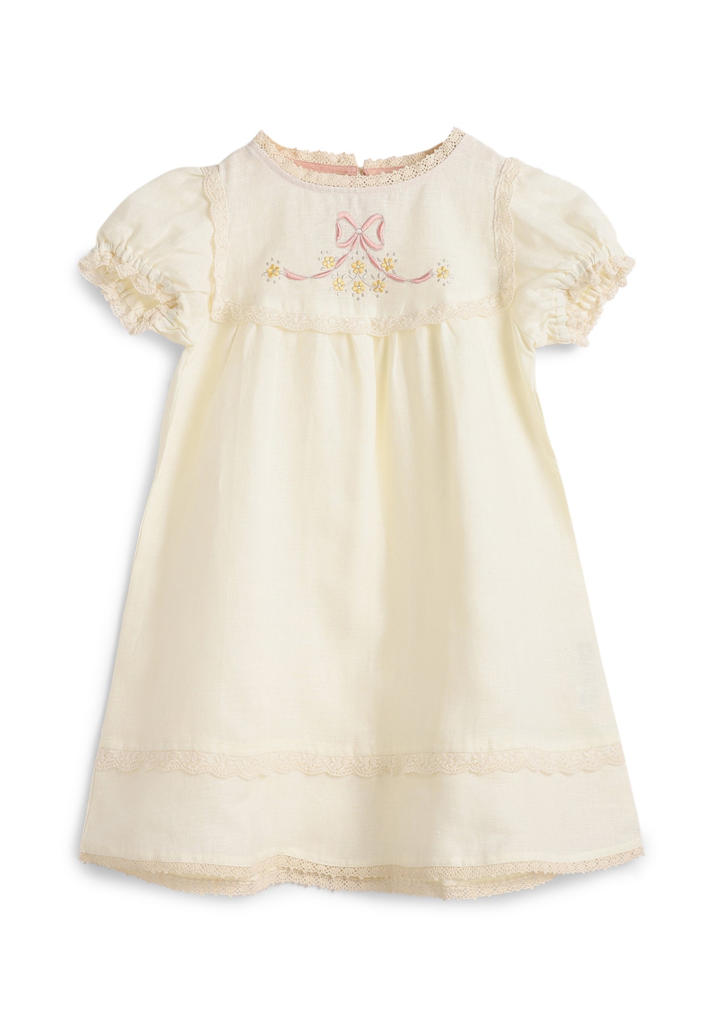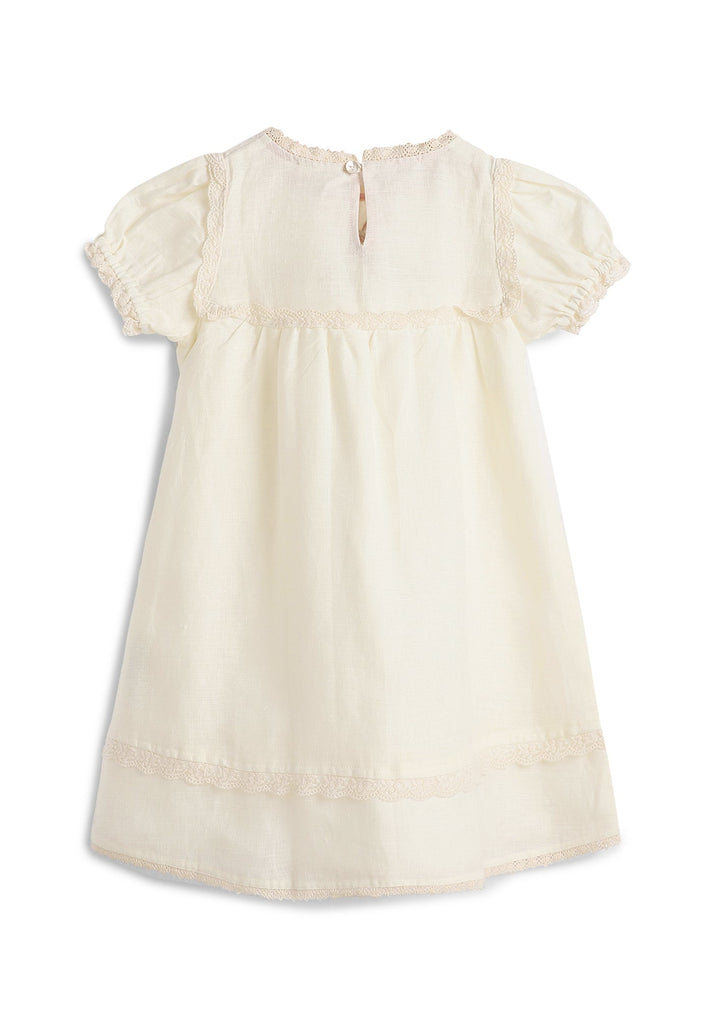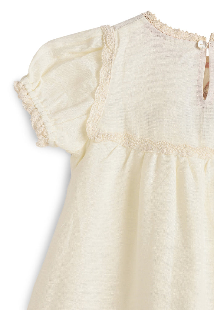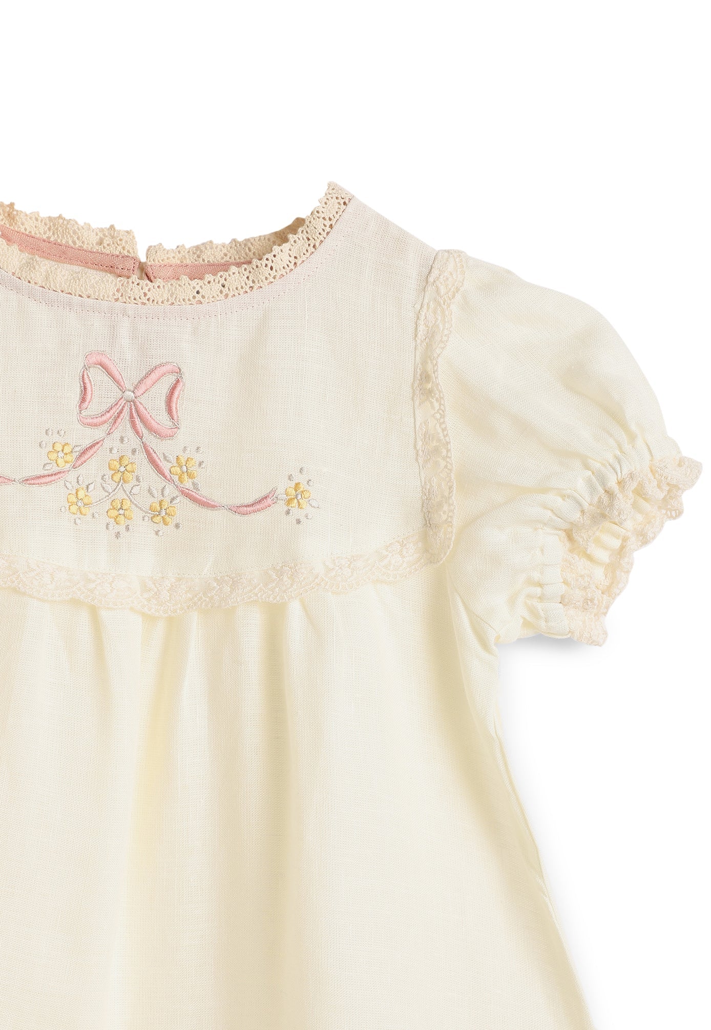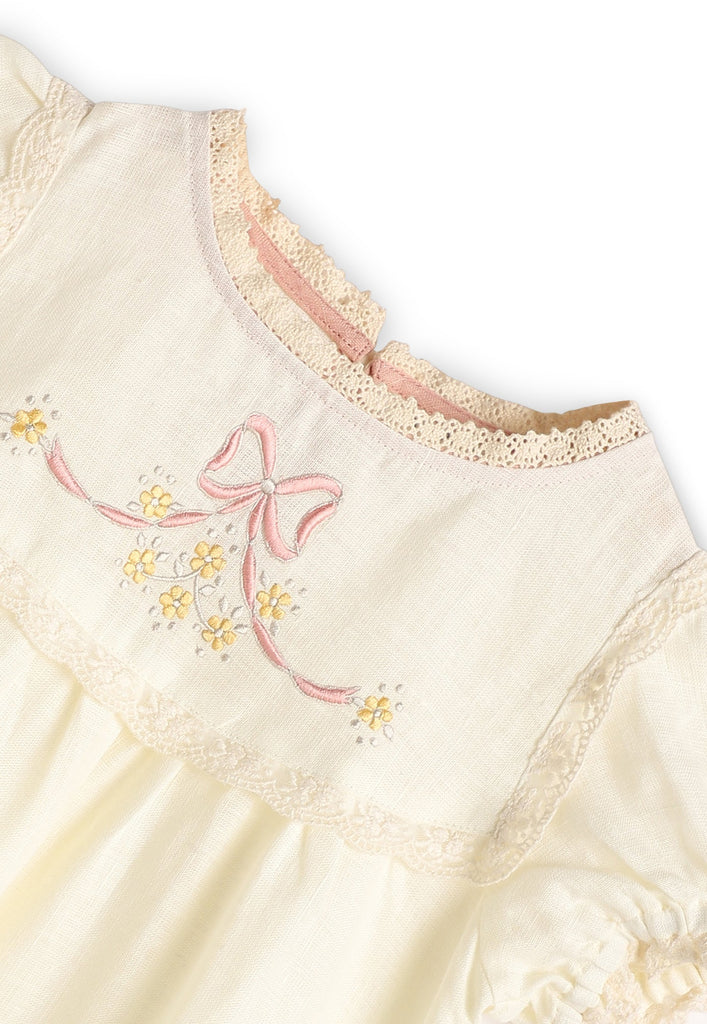 Victorian style dress with adorable lace details and small puff sleeves. Embroidered with a sweet bow motif - perfect for the little princess.