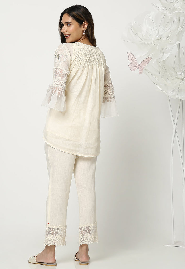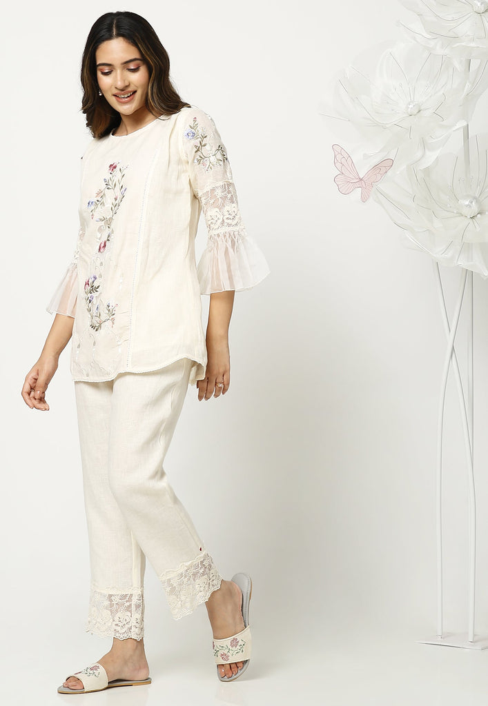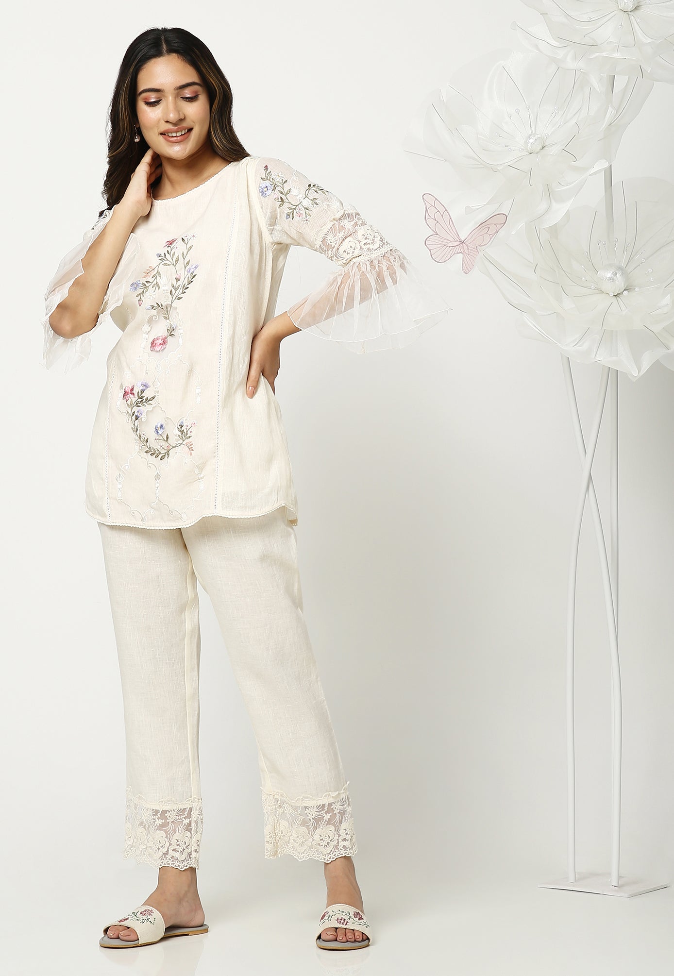 • Hand-embroidered in multi-coloured flowers with a mix of organza and linen cut work.