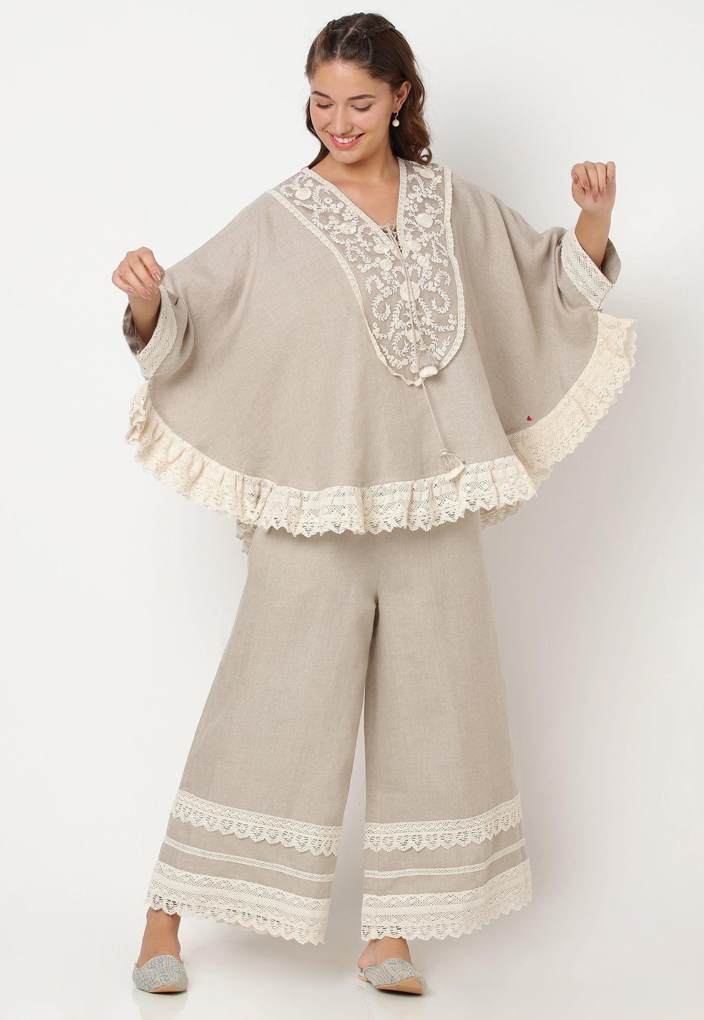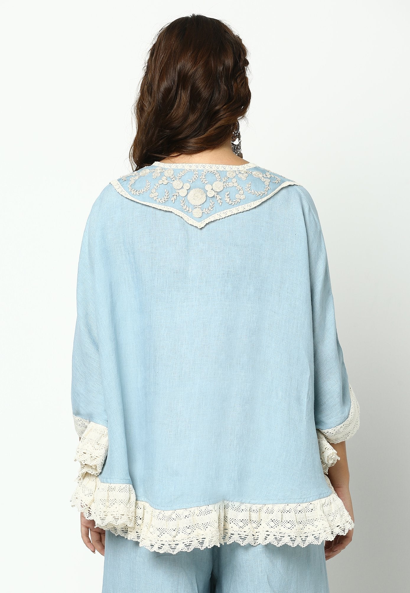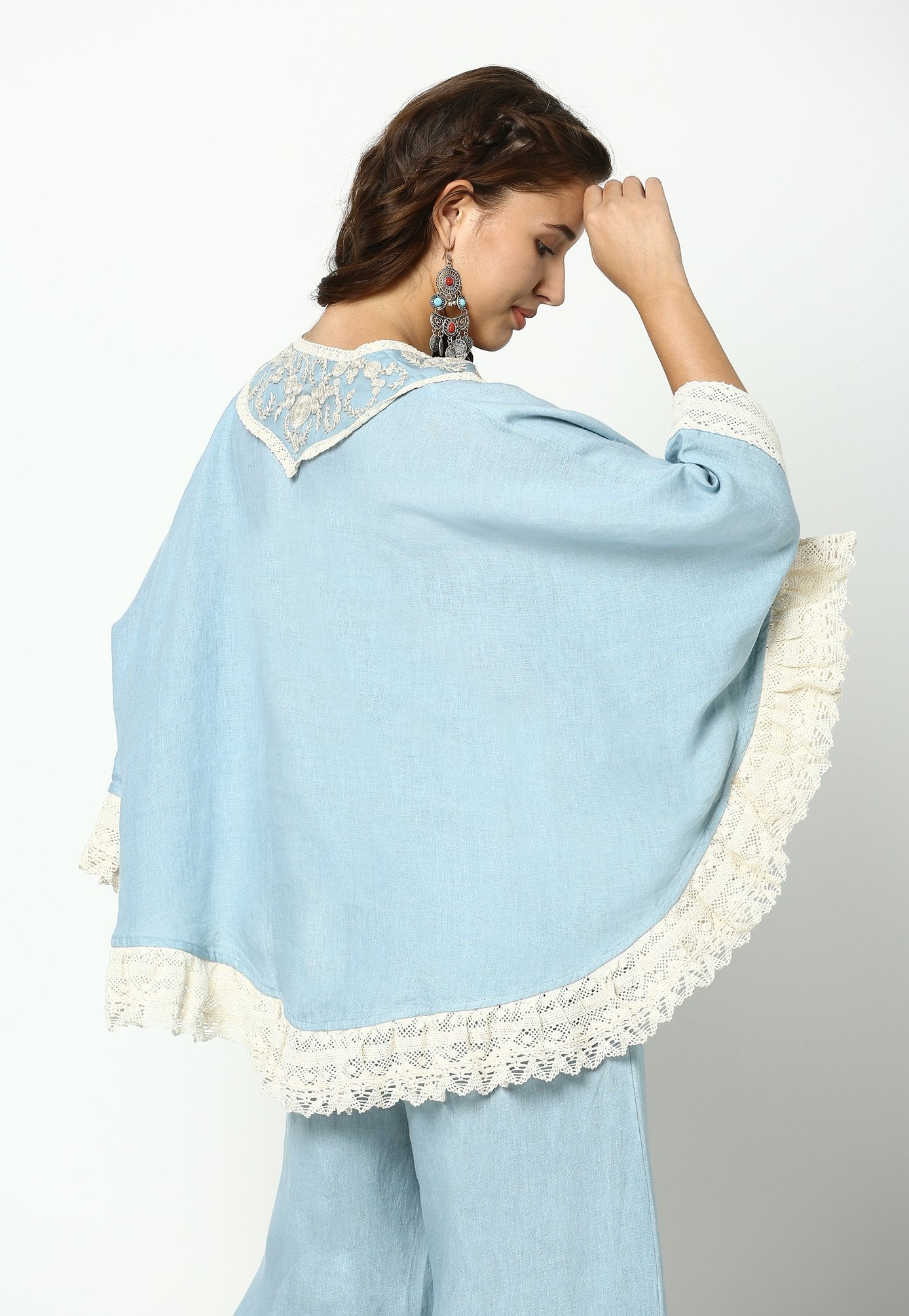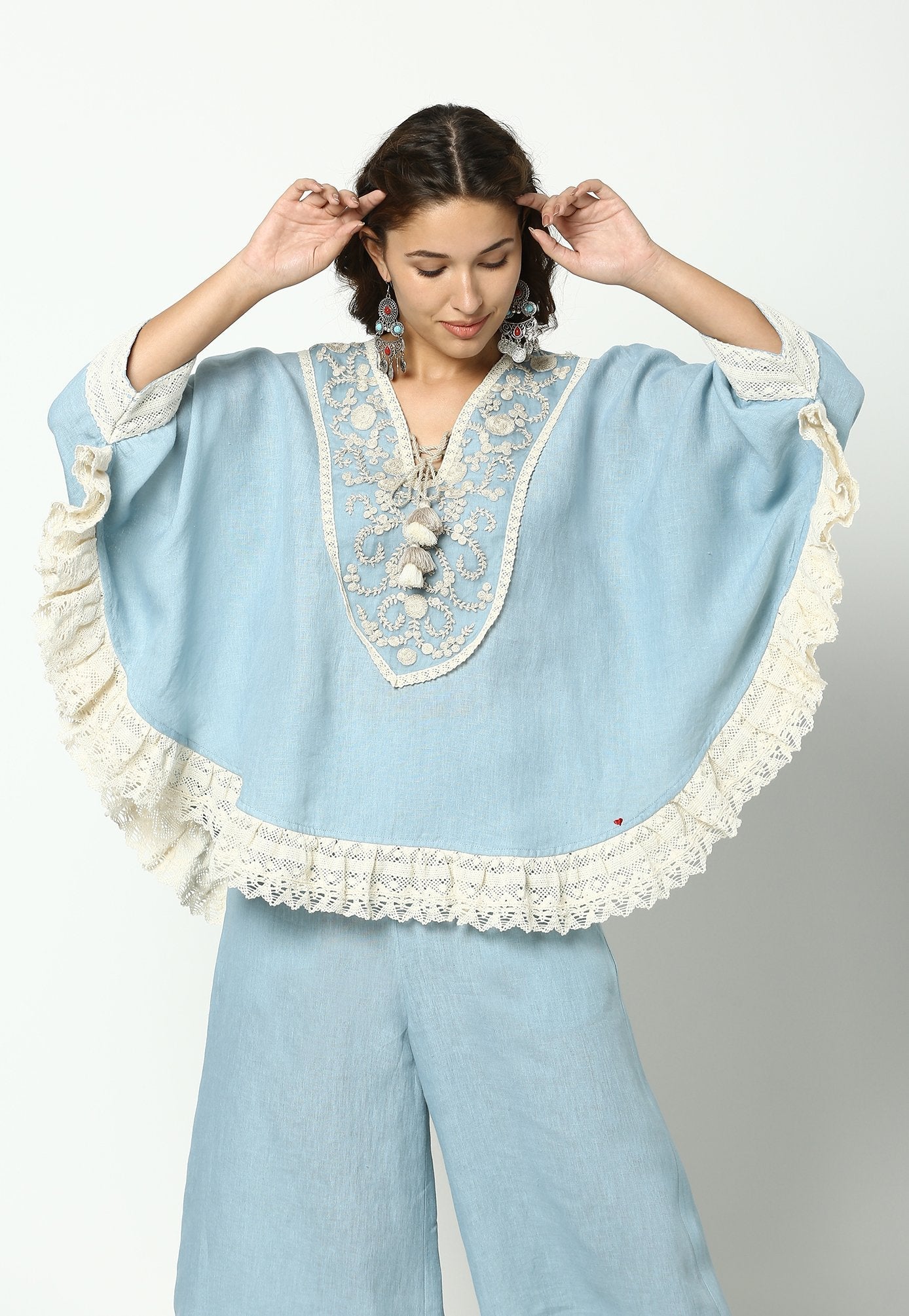 Fun and flirty circular poncho top with garlands and halos of detailed and thickly embroidered thread flowers that embellish the front and back yokes with a tie-up at the neckline. Ruffled crochet laces all along the circular hem make this top simply adorable and glorious. Pairs beautifully with our flared lace pants.