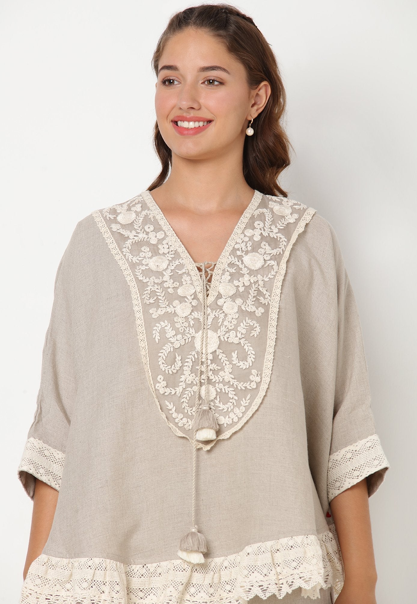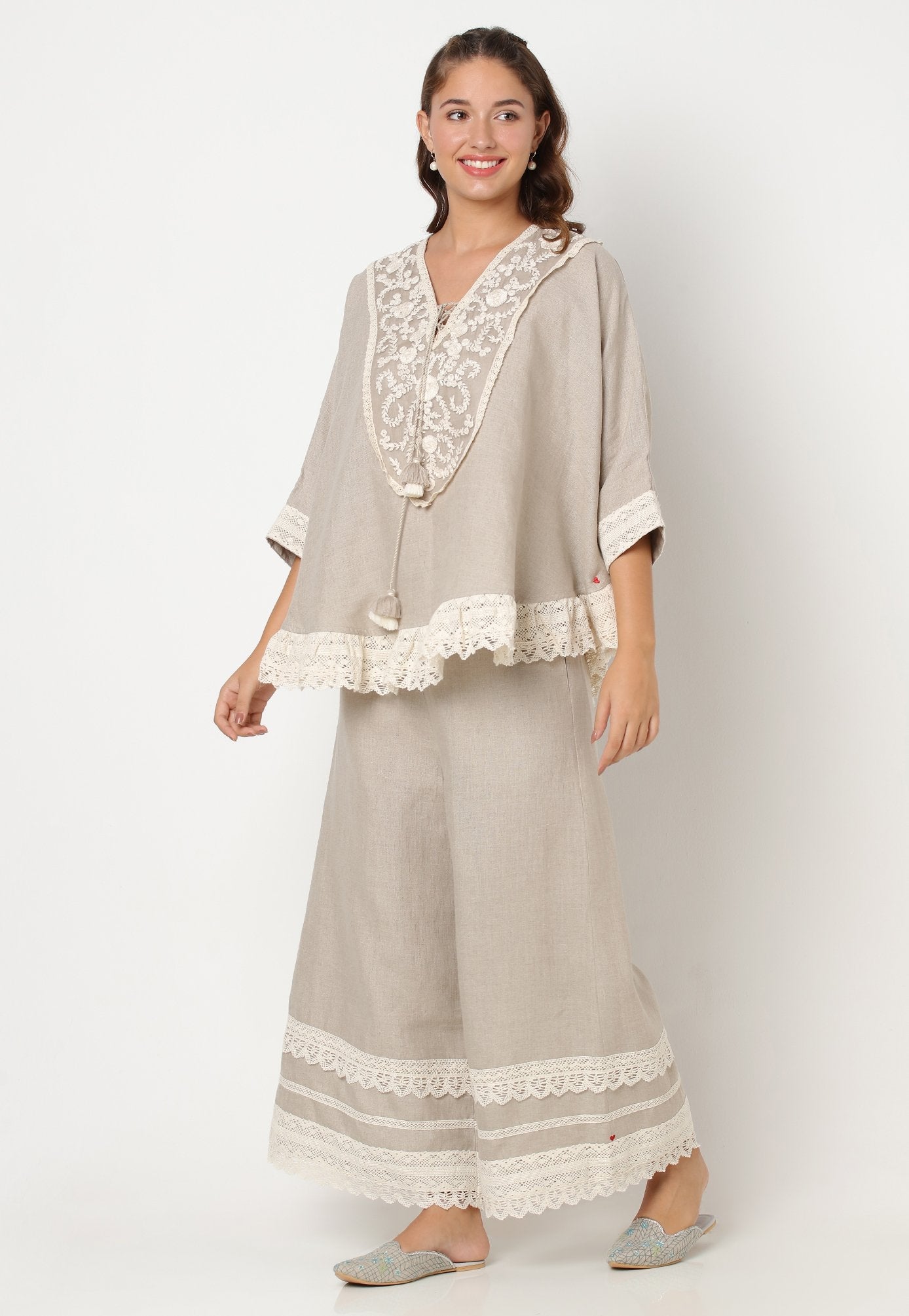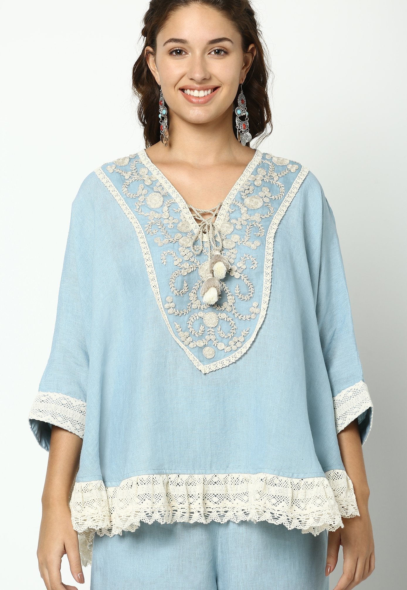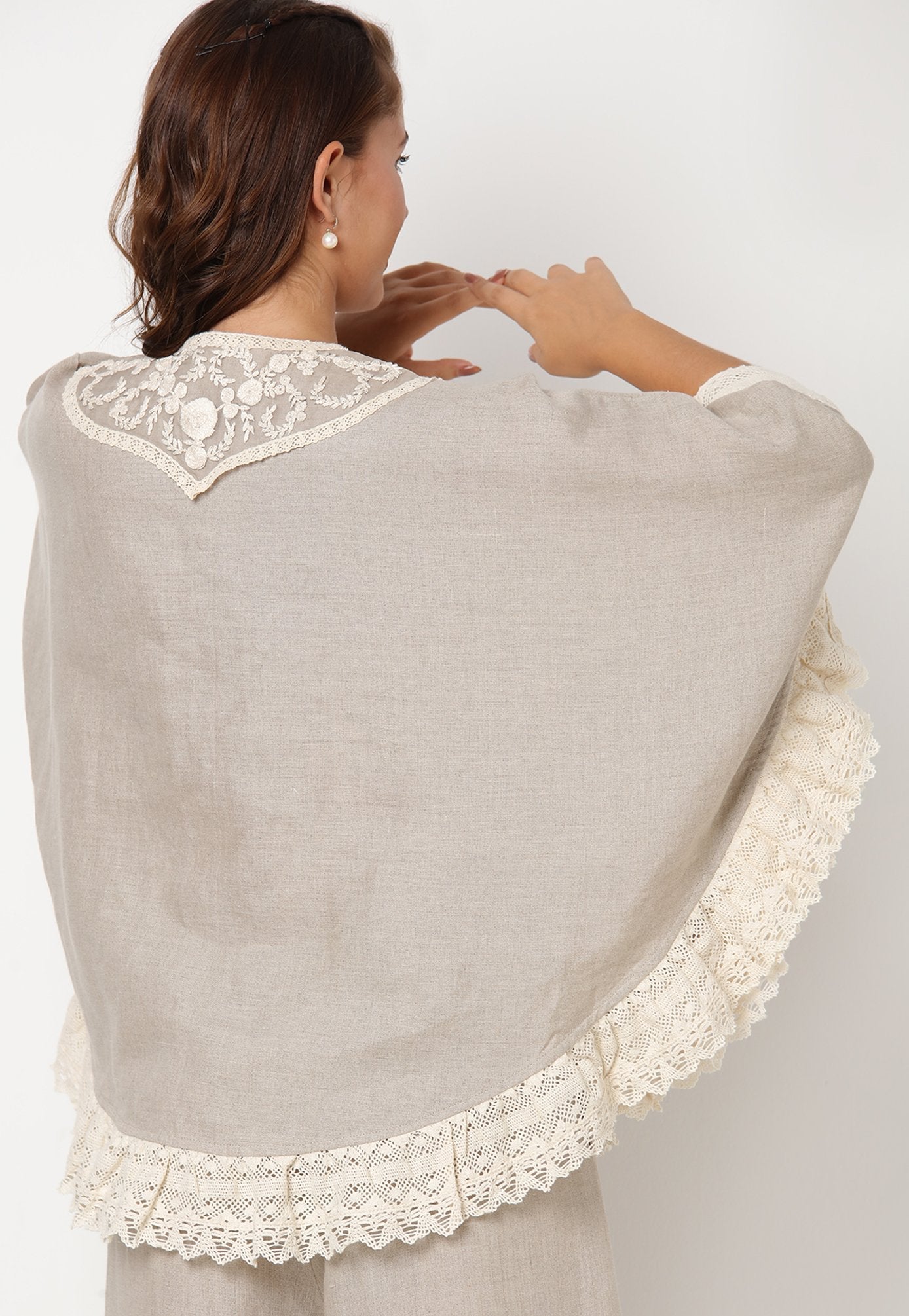 Fun and flirty circular poncho top with garlands and halos of detailed and thickly embroidered thread flowers that embellish the front and back yokes with a tie-up at the neckline. Ruffled crochet laces all along the circular hem make this top simply adorable and glorious. Pairs beautifully with our flared lace pants.