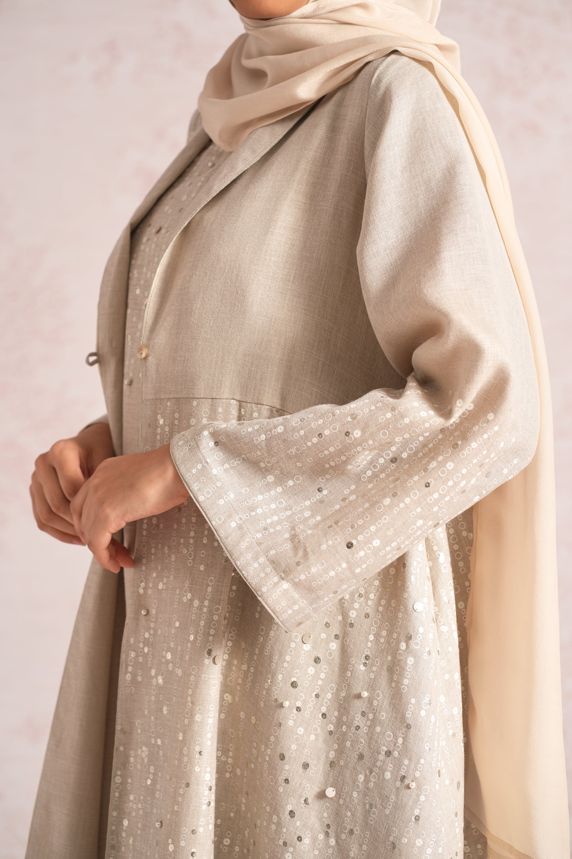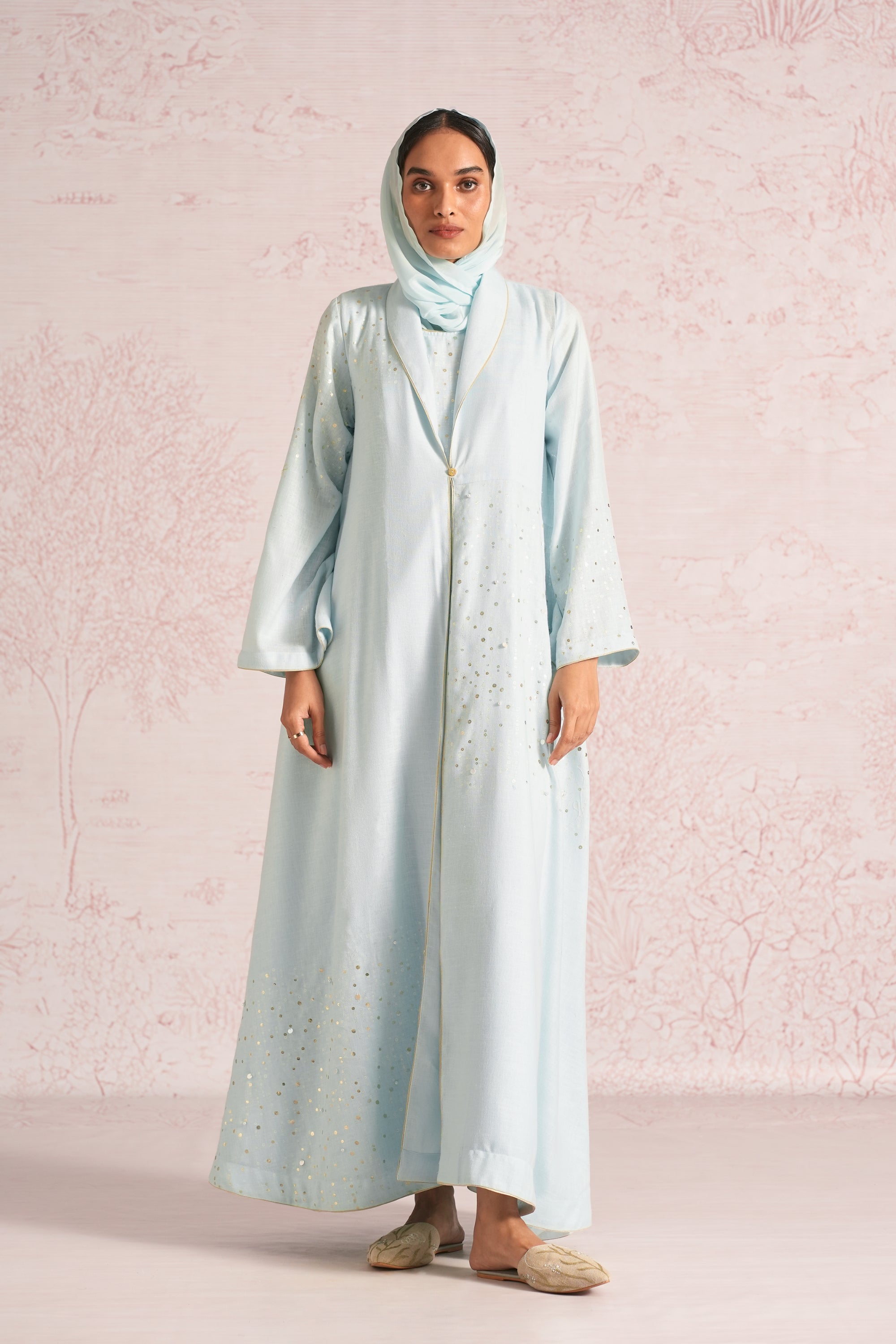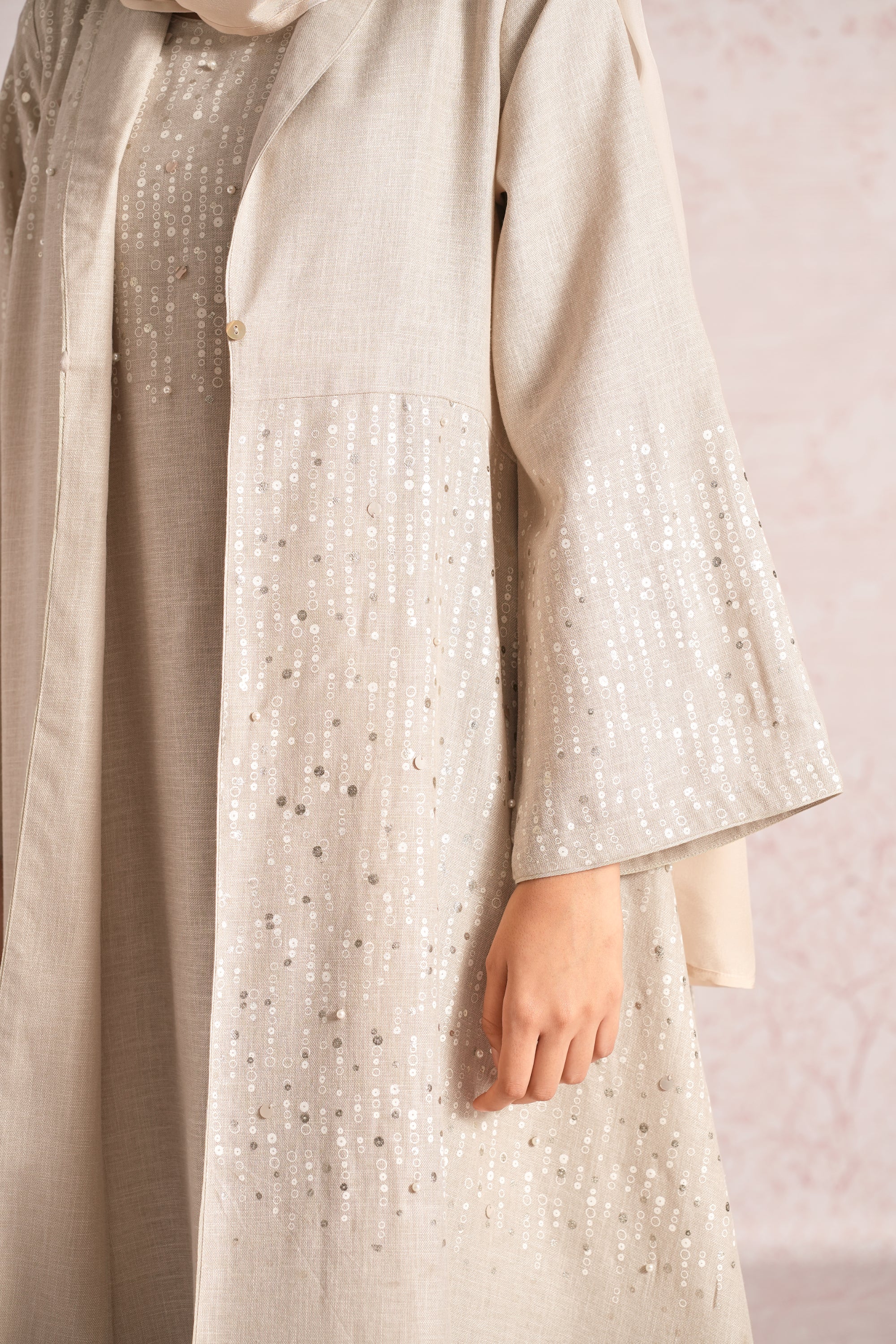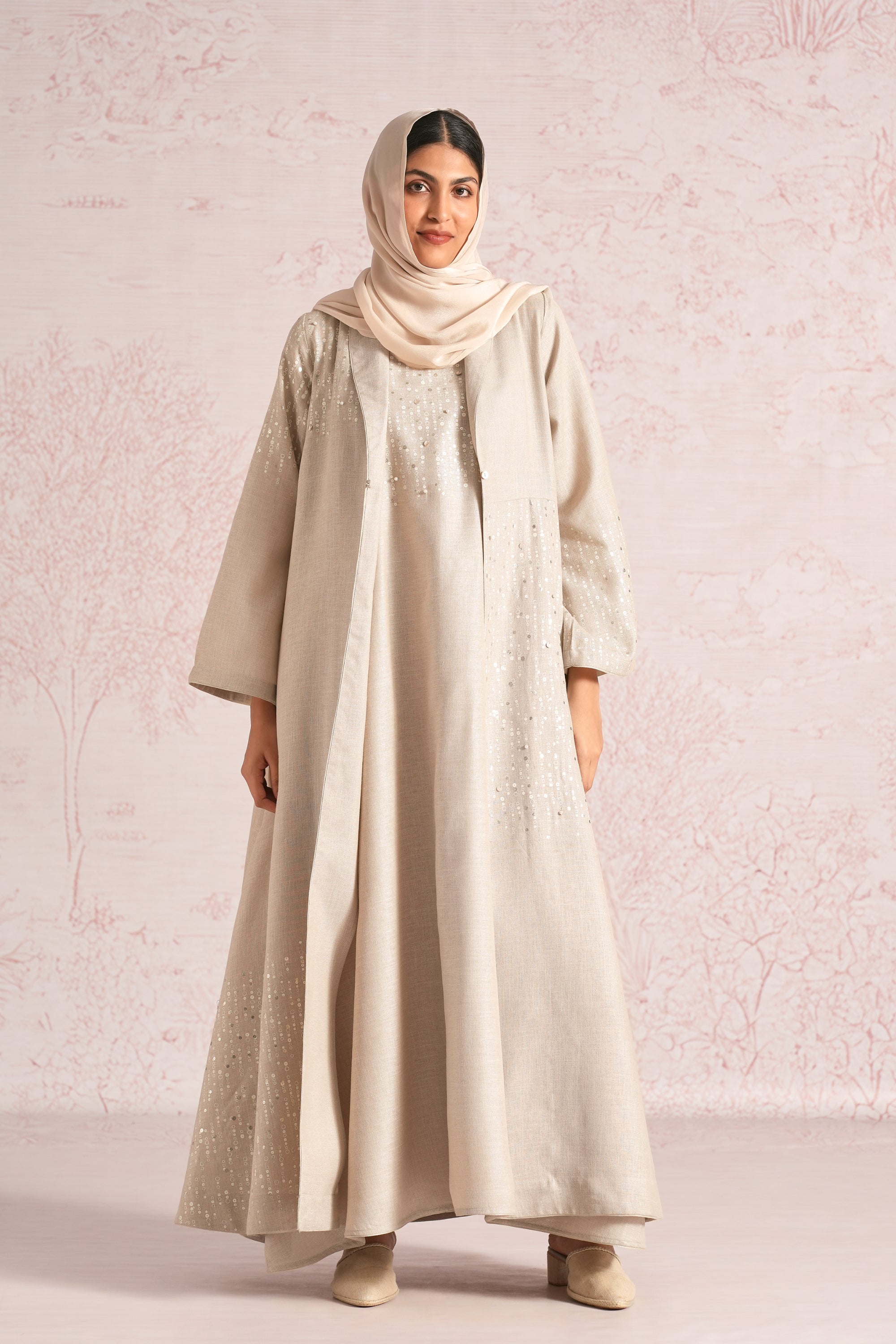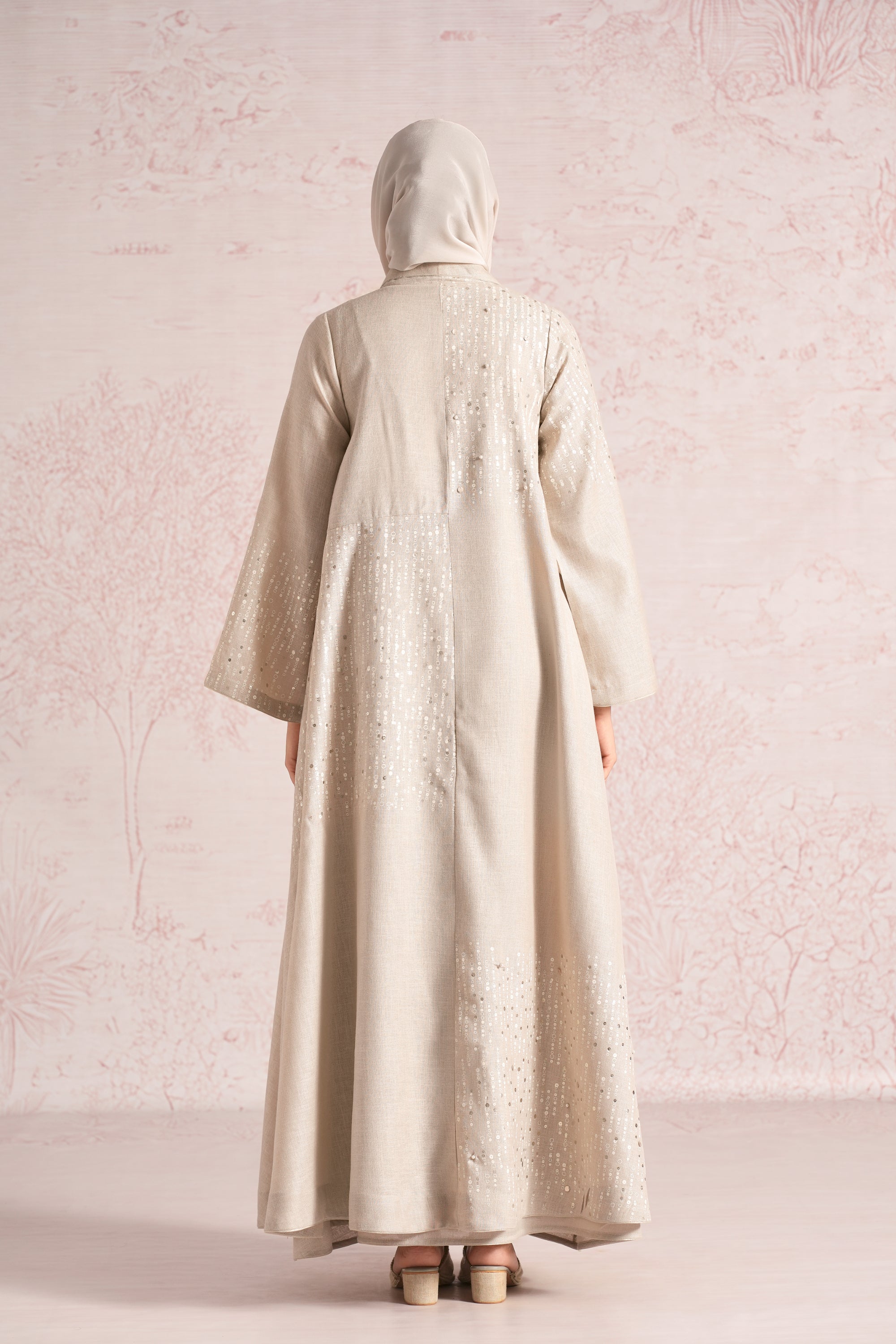 •This abaya is crafted in a relaxed, flowing silhouette with wide sleeves and an elegant drape, enhanced by an asymmetric empire cut for a modern touch. A delicate screen print infused with ice-gold shimmer runs through the abaya and the inner dress, elevated with bead and sequin embroidery along the empire line, sleeve hems, and abaya hem. The inner dress is fully detailed with coordinated print and embellishment, adding depth, texture, and a refined luminous finish.