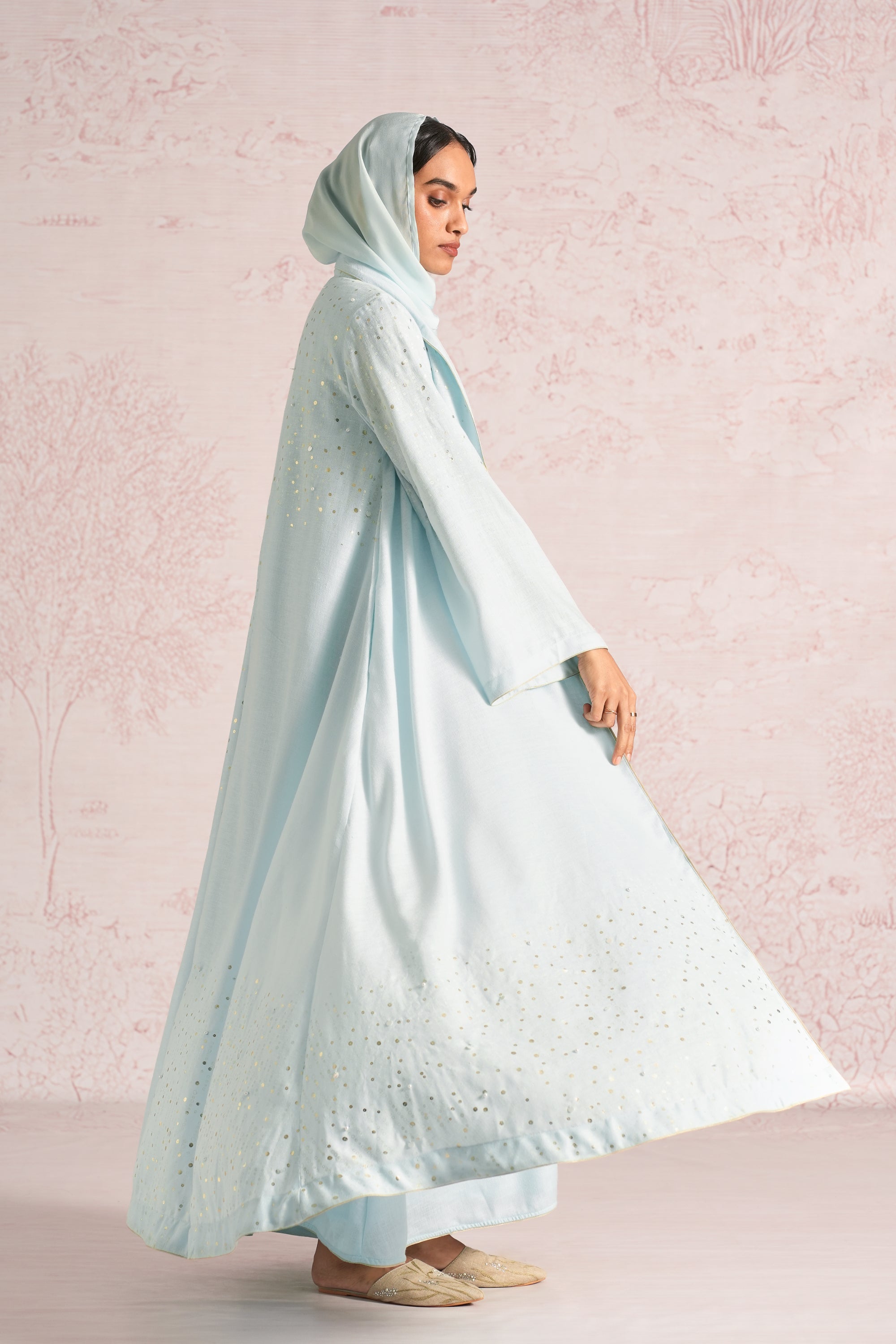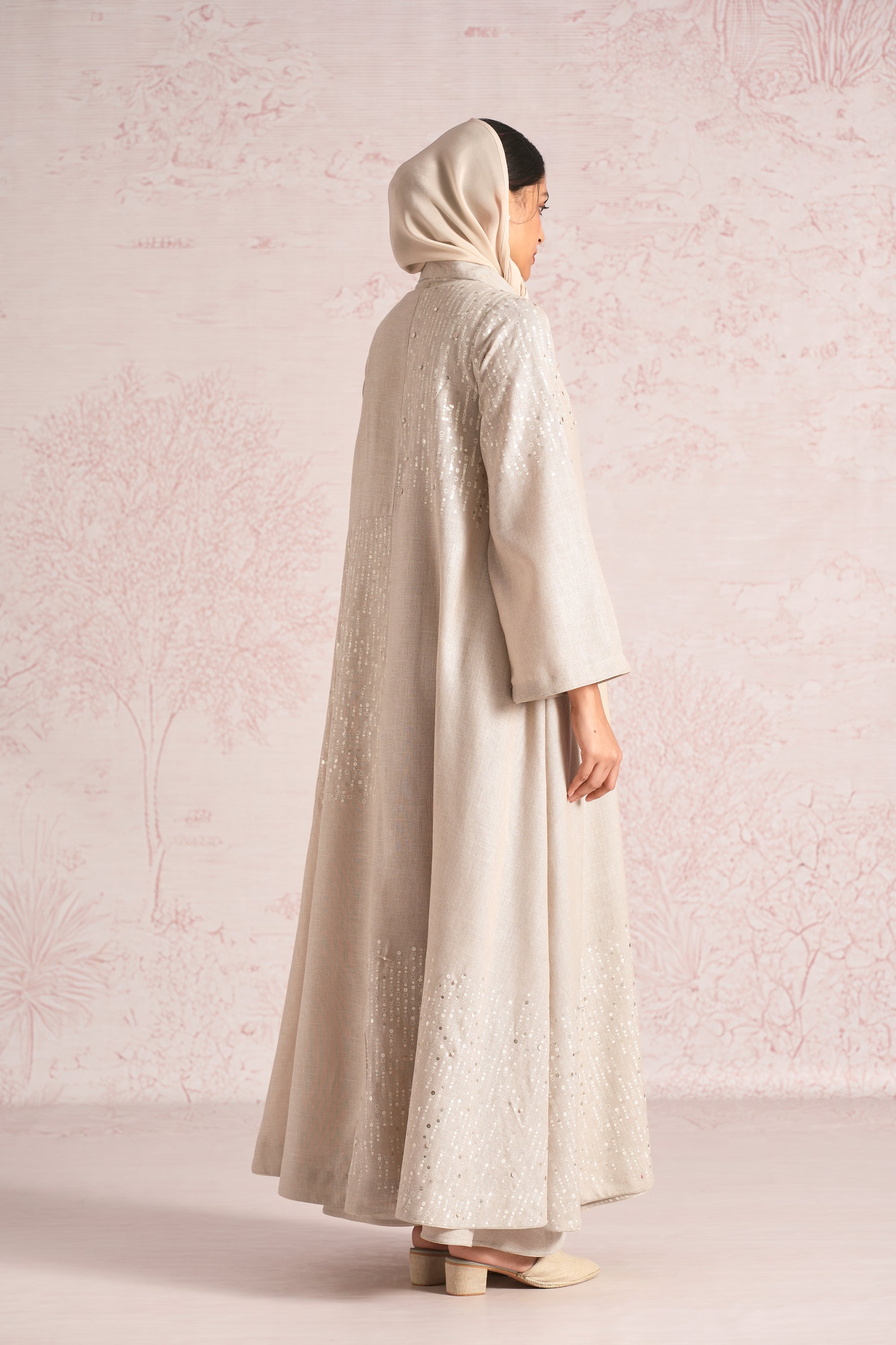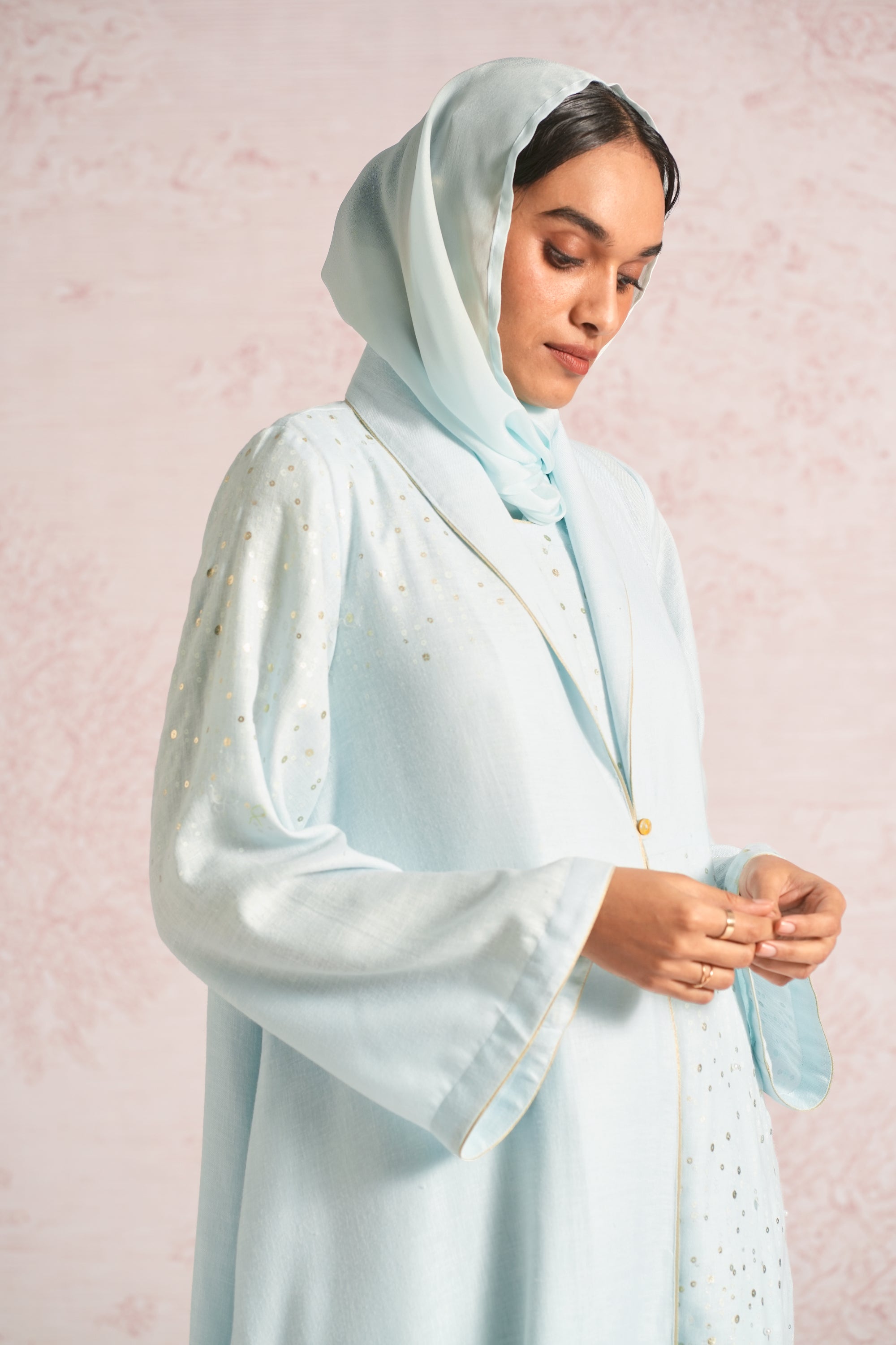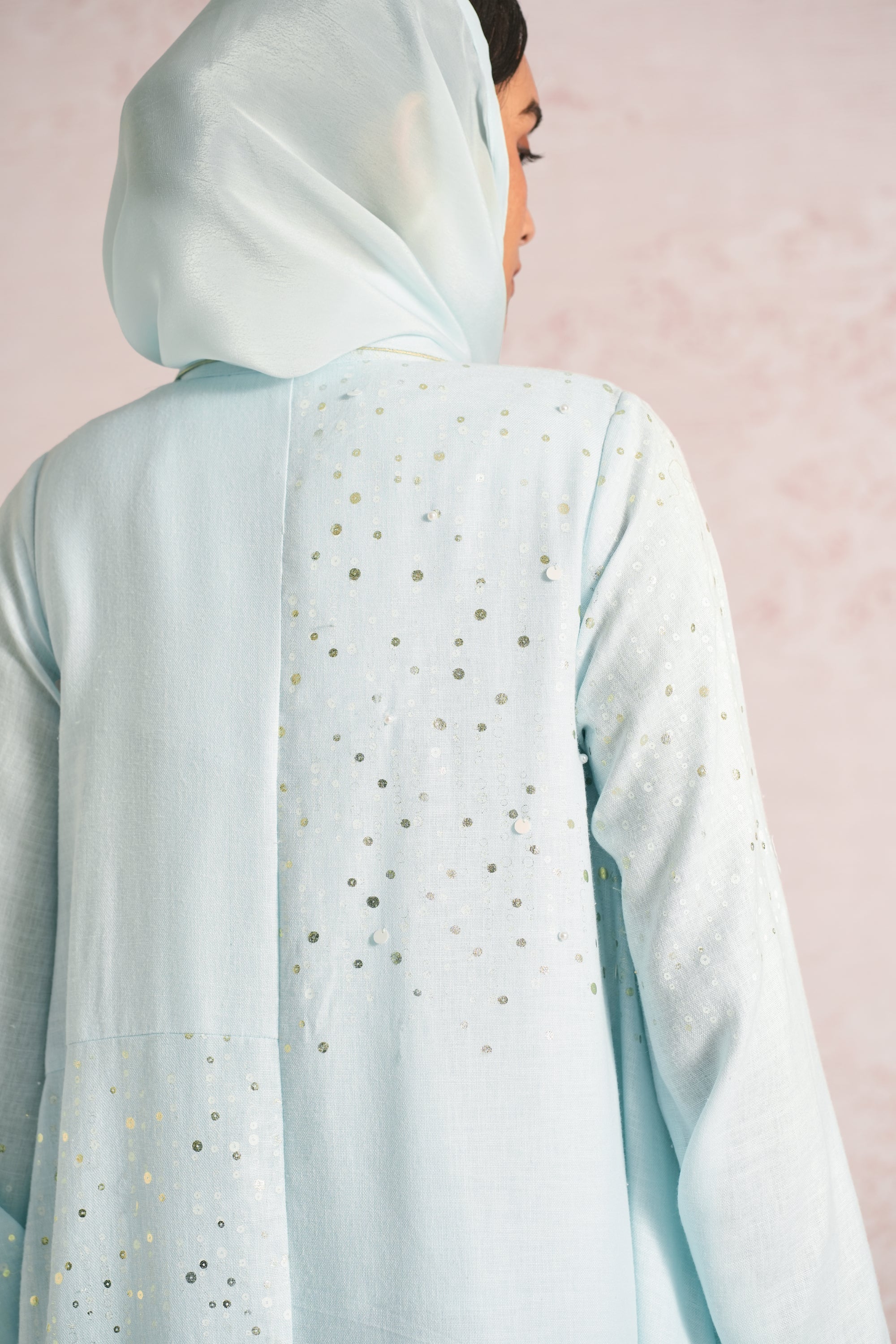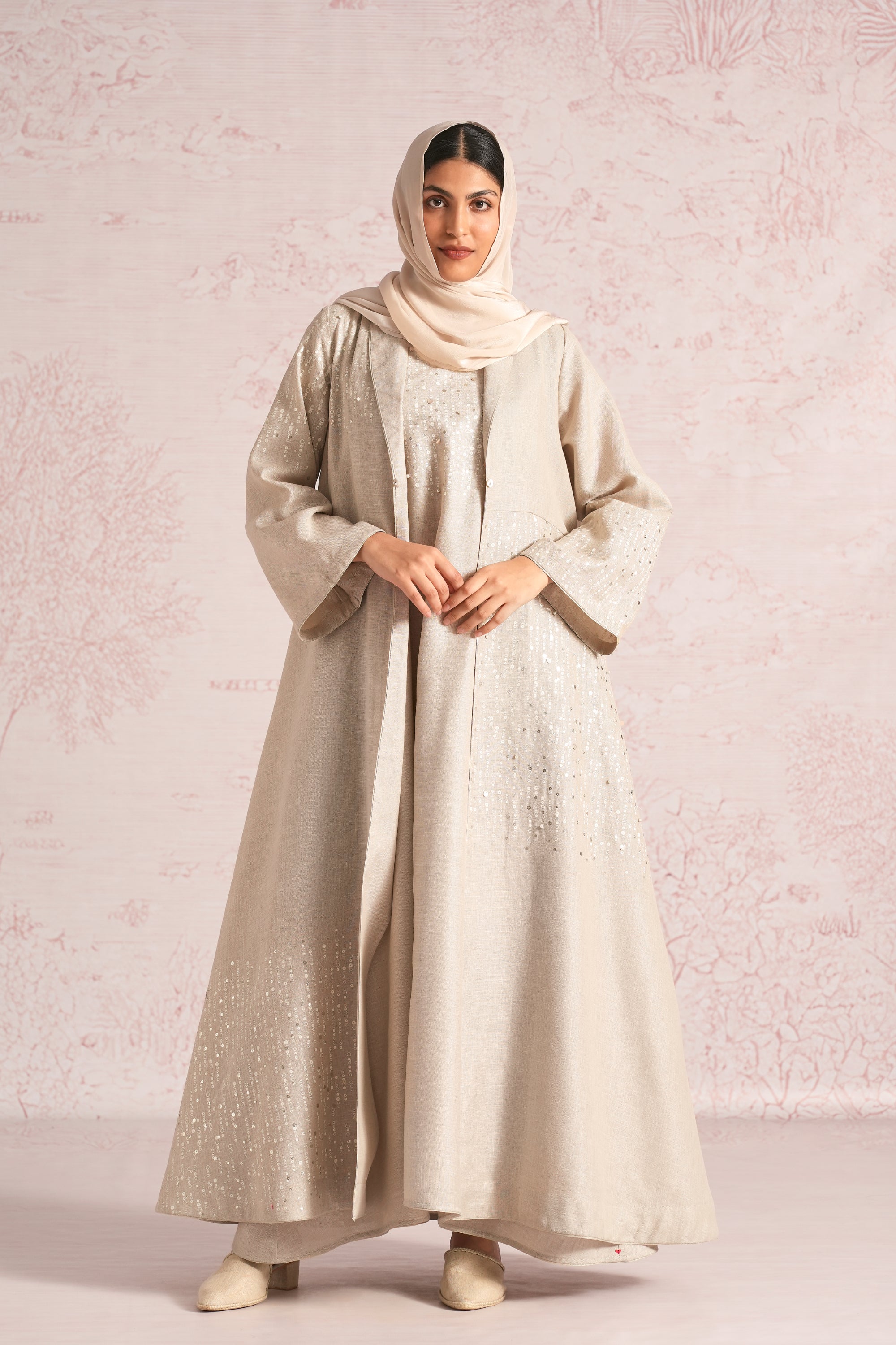•This abaya is crafted in a relaxed, flowing silhouette with wide sleeves and an elegant drape, enhanced by an asymmetric empire cut for a modern touch. A delicate screen print infused with ice-gold shimmer runs through the abaya and the inner dress, elevated with bead and sequin embroidery along the empire line, sleeve hems, and abaya hem. The inner dress is fully detailed with coordinated print and embellishment, adding depth, texture, and a refined luminous finish.