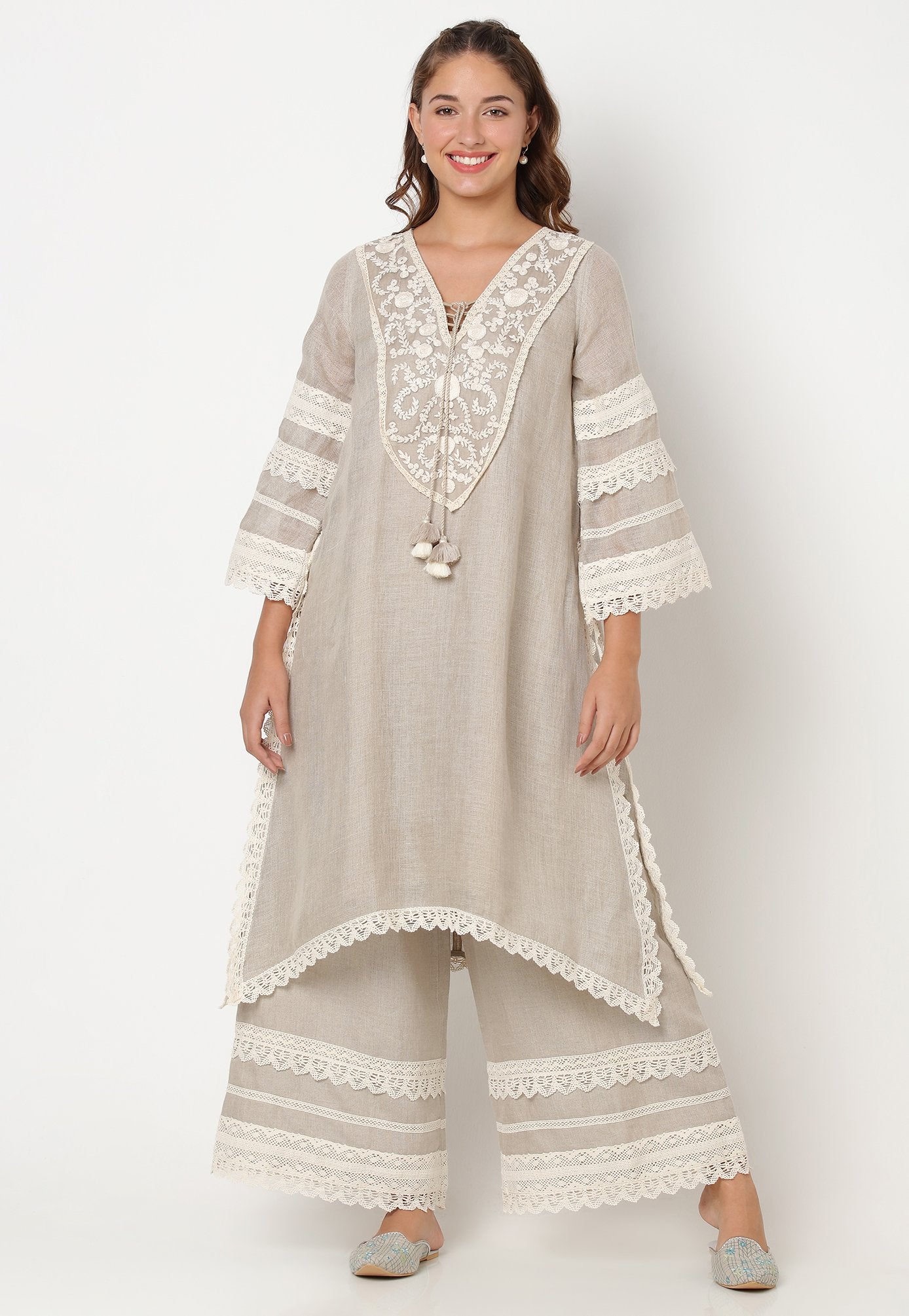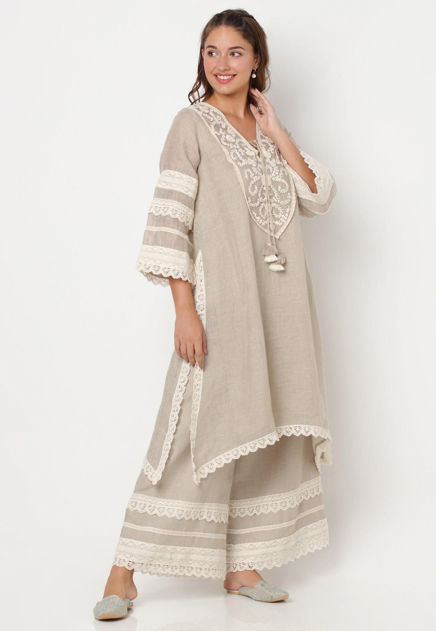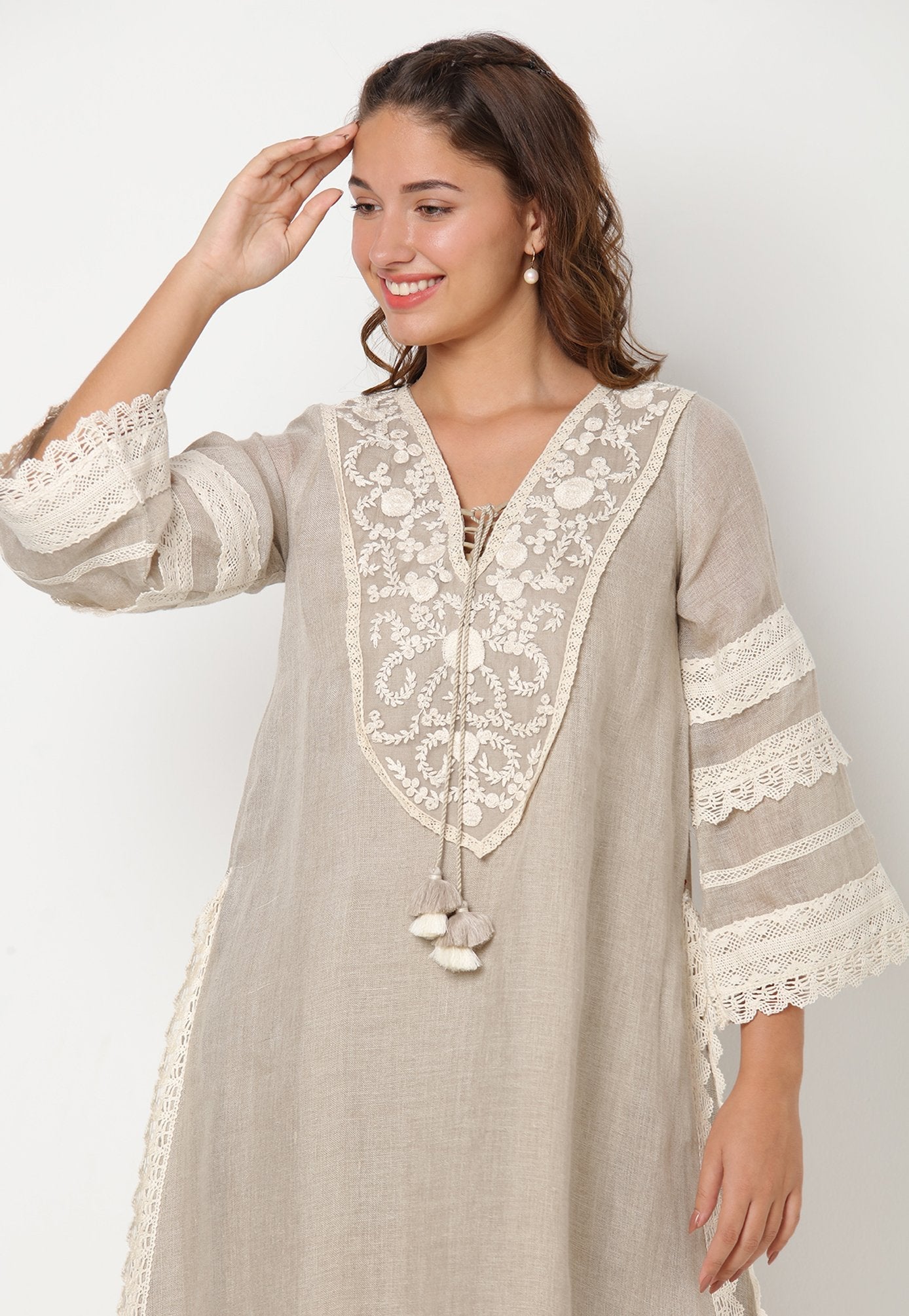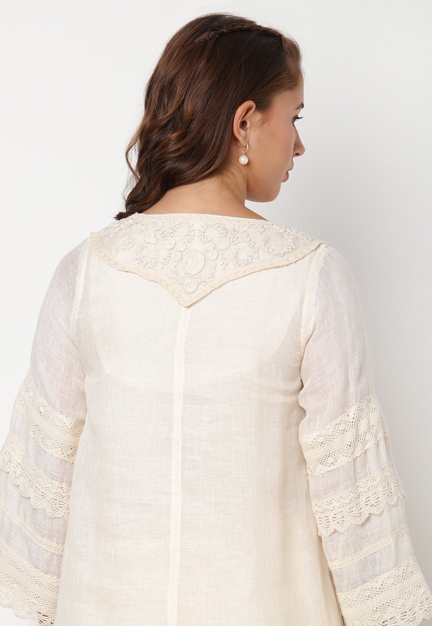 Our signature Fly Free Tunic – a flared tunic with a swallow tail hem and hi – slits with garlands and halos of detailed and thickly embroidered thread flowers that embellish the front and back yokes with a tie-up at the neckline. Crochet laces line the sleeves, hemline and along the side slits of the tunic. Pairs beautifully with our flared lace pants.
