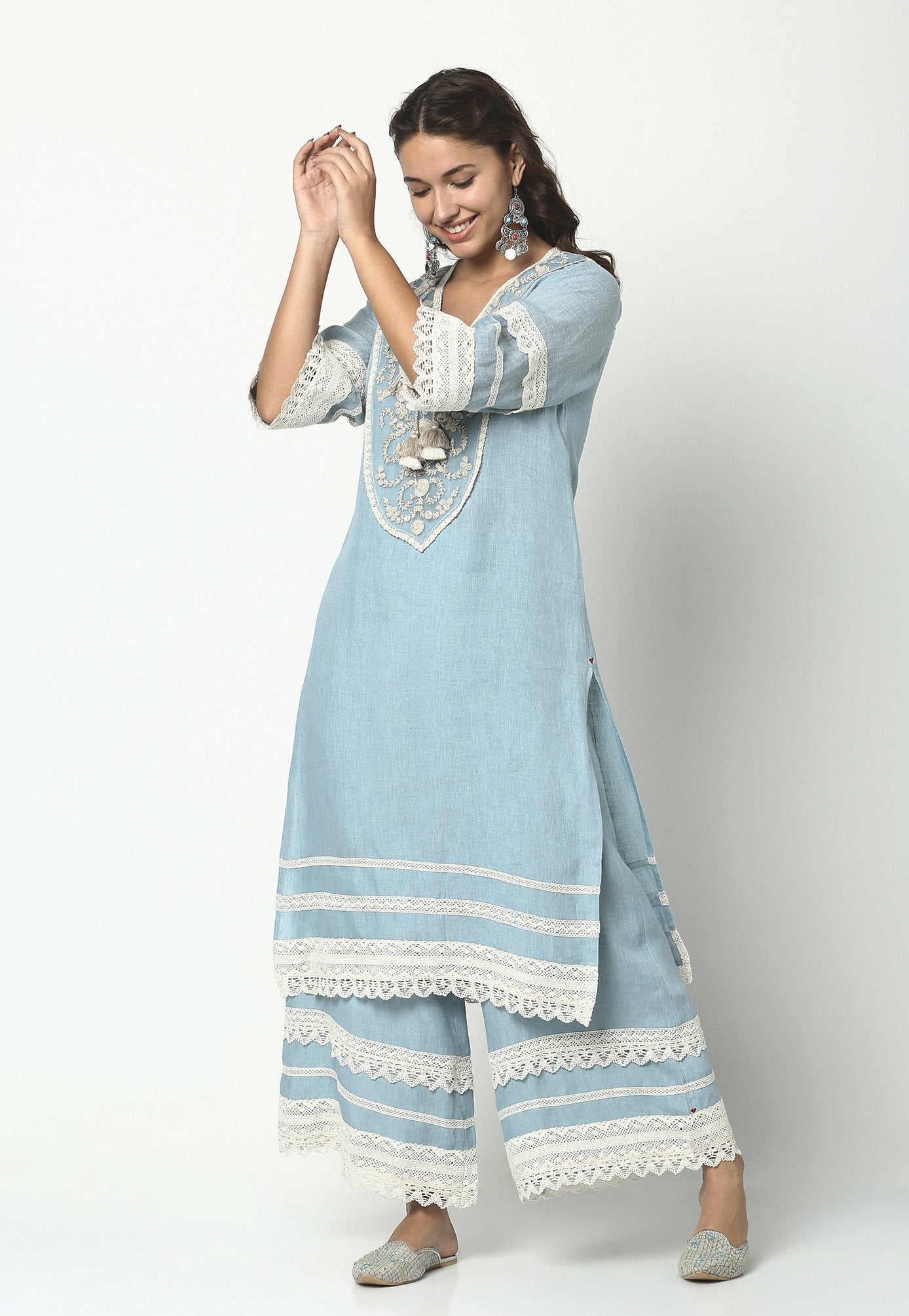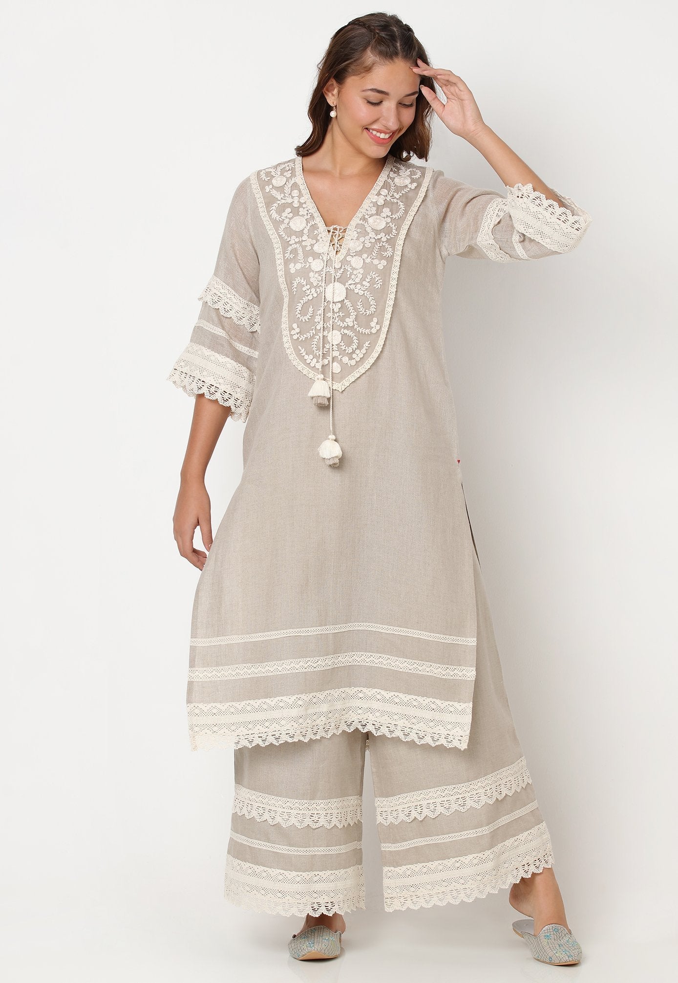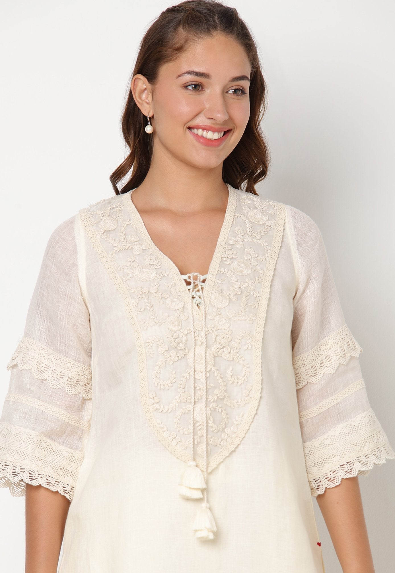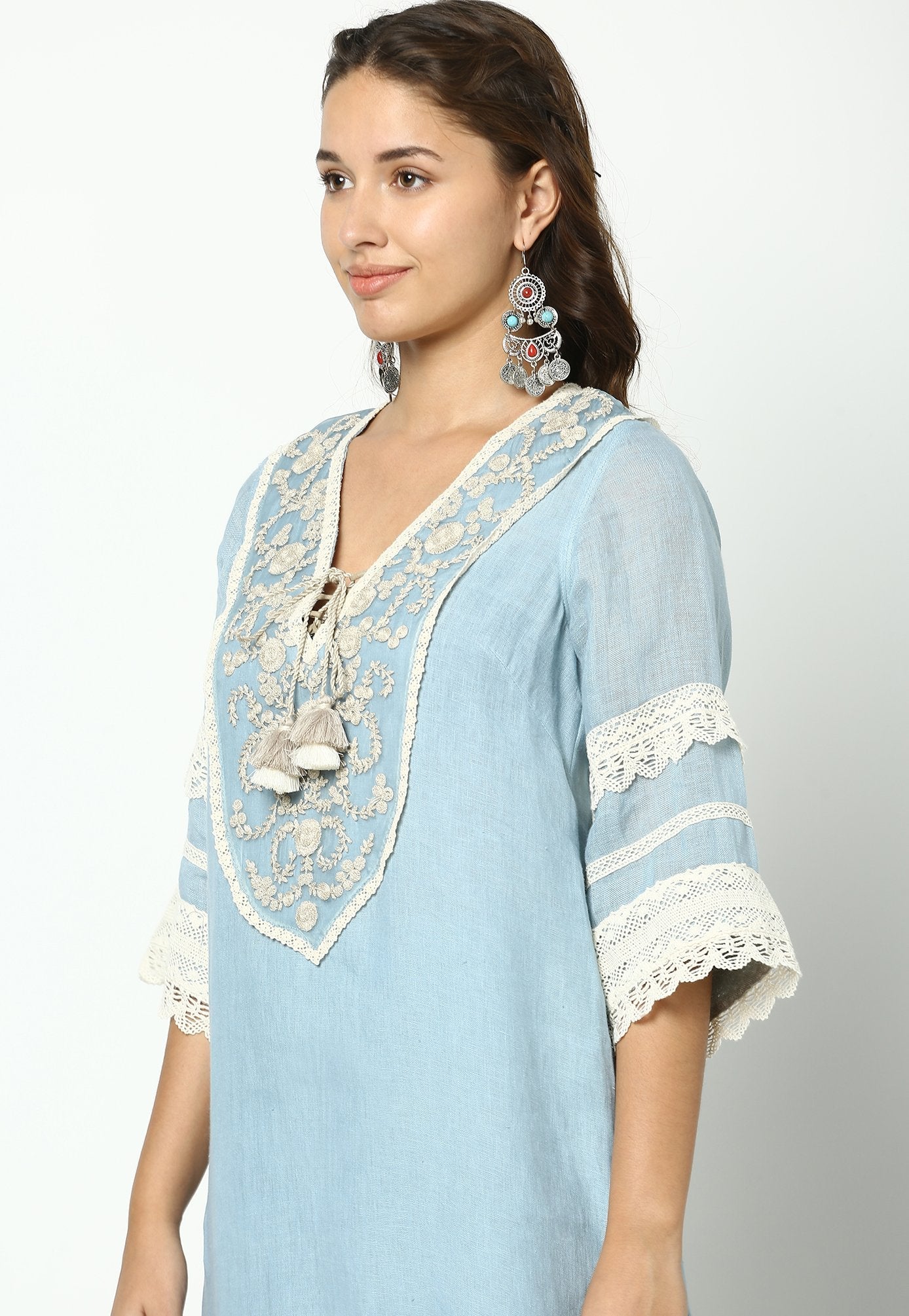 Our signature Tunic – with garlands and halos of heavy embroidered thread flowers that embellish the front and back yokes with a tie-up at the neckline. Crochet laces line the sleeves, hemline and along the side slits of the tunic. Pairs beautifully with our flared lace pants.