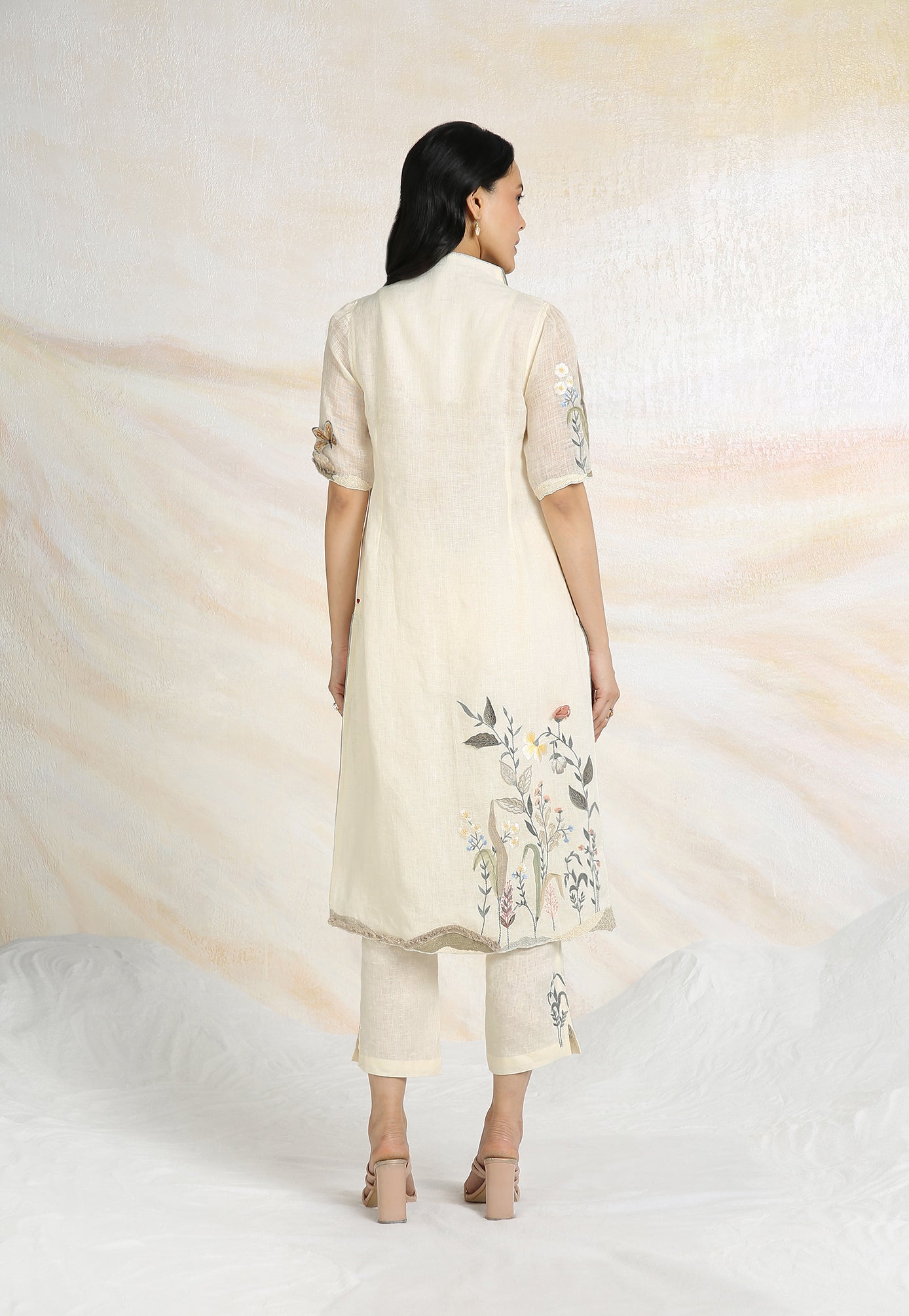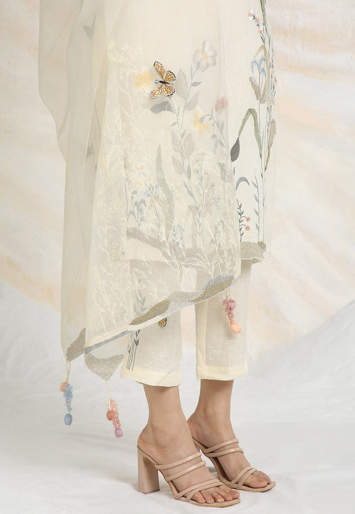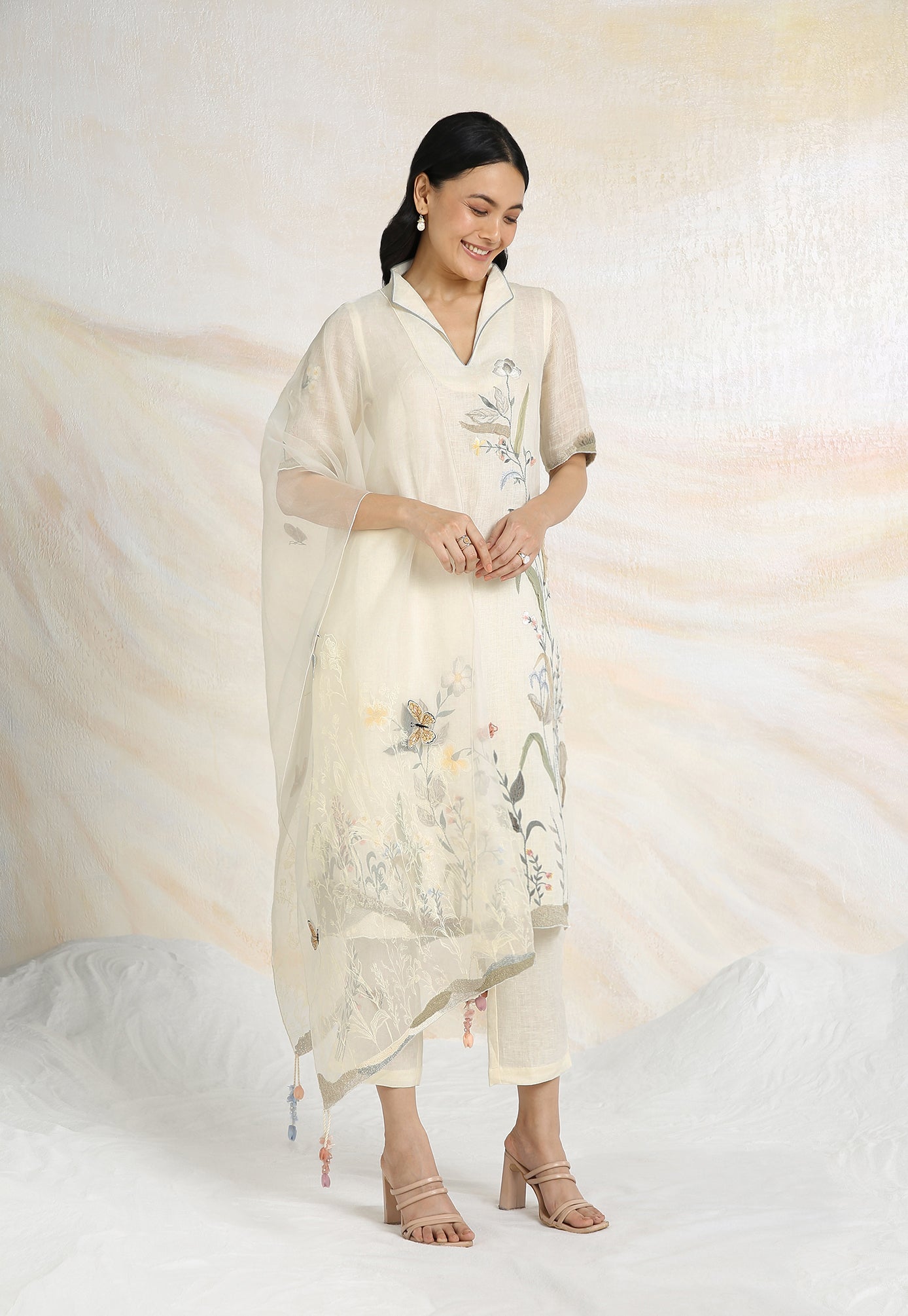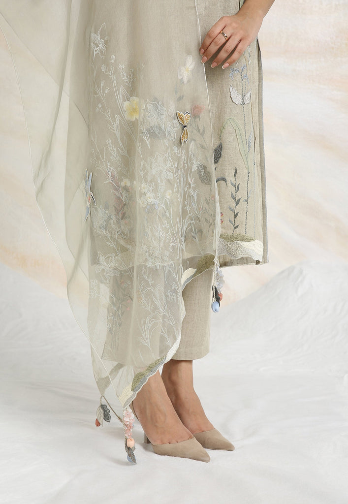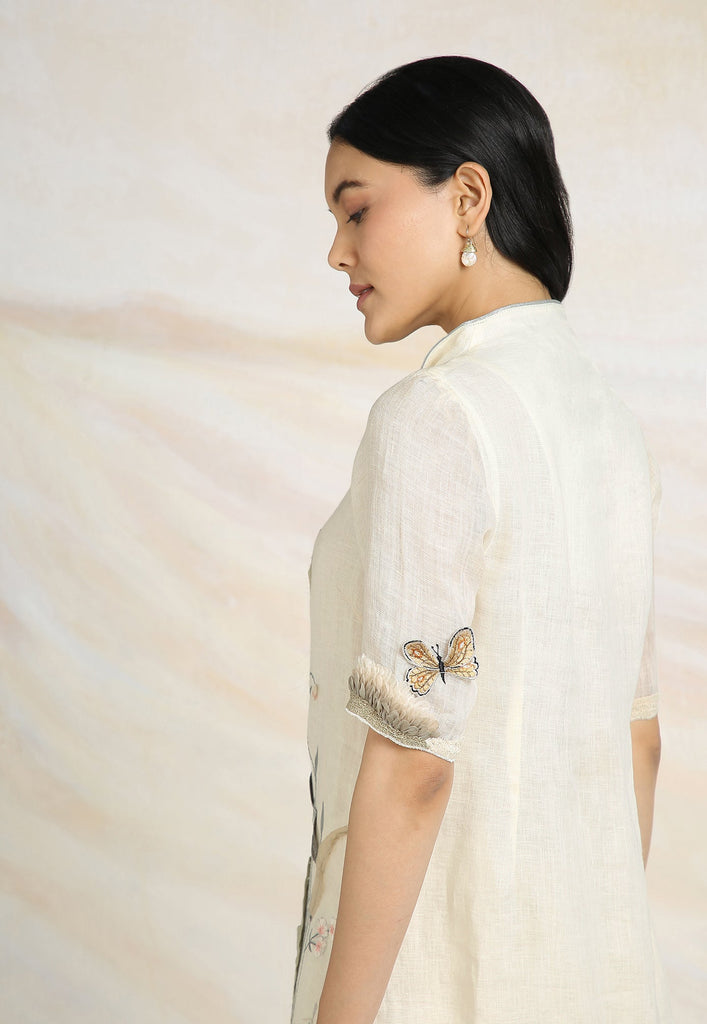 Embrace the charming wonder of the wilderness and stroll into our Prairie. A stunning work of art bringing the likeness of a captivating garden to garment. Each piece is immaculately hand-embroidered and handcrafted utilizing intricate layers of anchor thread and silk thread embroidery; adding depth with dimension to the piece while dainty elements of birds, butterflies and blooms unfurl in the forefront- individually sculpted and delicately appliquéd to the fabric. A final touch of ornate lace edging and handmade tassels finish the piece with panache bringing the outdoors in, just in time for a fresh new season.