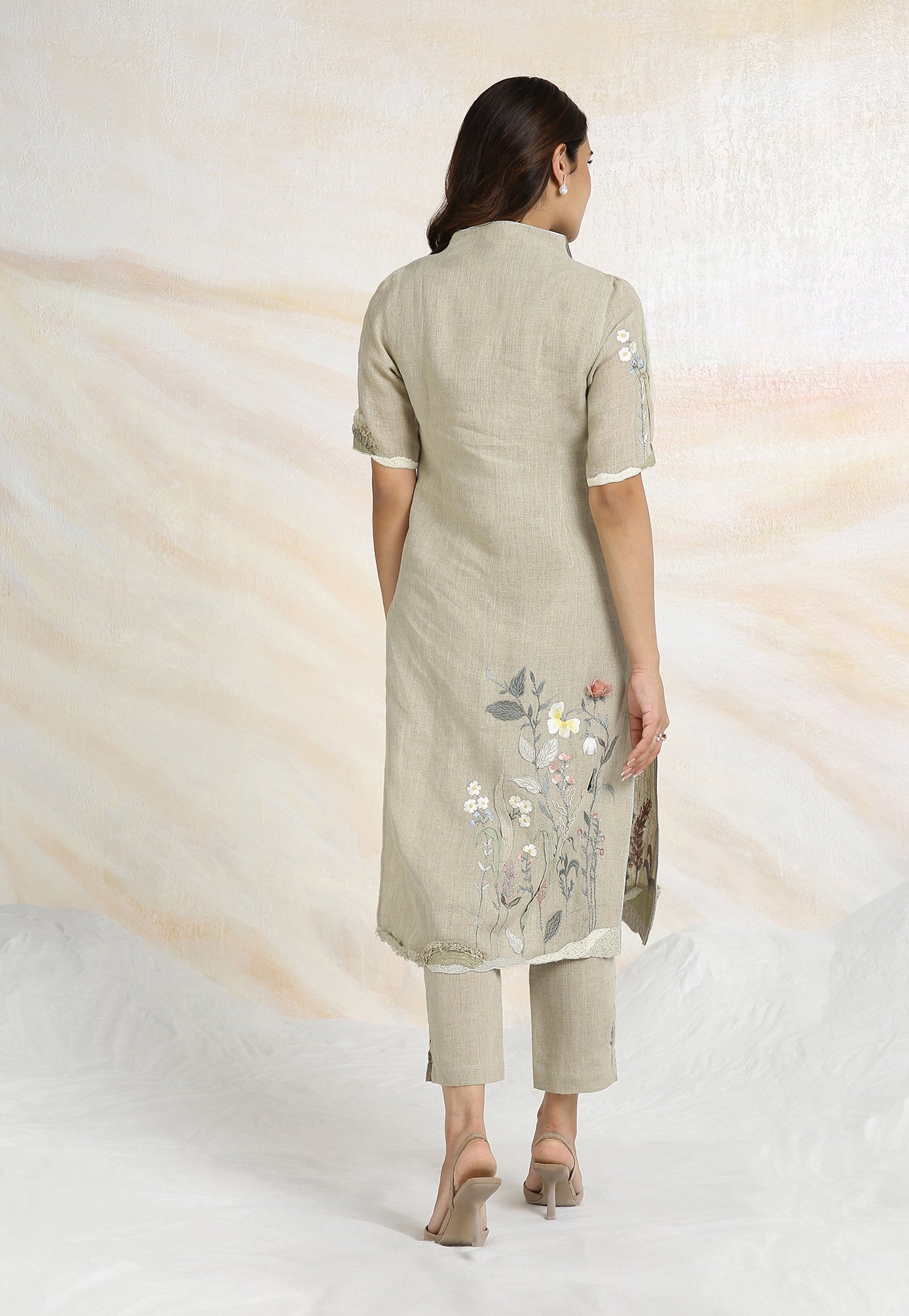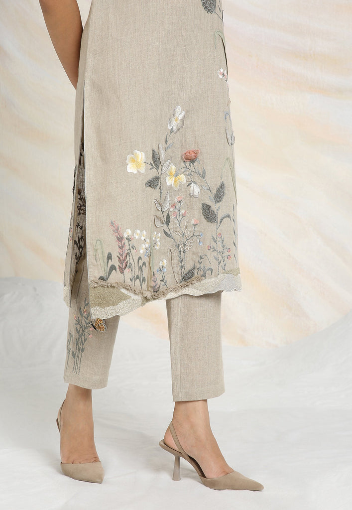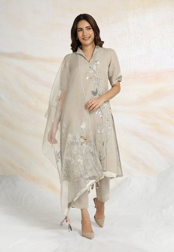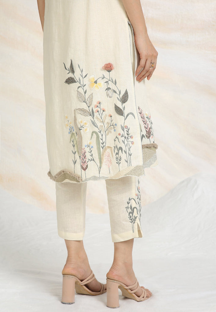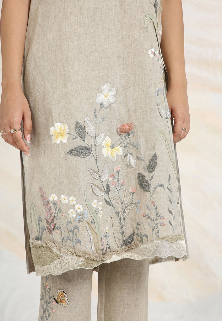 Embrace the charming wonder of the wilderness and stroll into our Prairie. A stunning work of art bringing the likeness of a captivating garden to garment. Each piece is immaculately hand-embroidered and handcrafted utilizing intricate layers of anchor thread and silk thread embroidery; adding depth with dimension to the piece while dainty elements of birds, butterflies and blooms unfurl in the forefront- individually sculpted and delicately appliquéd to the fabric. A final touch of ornate lace edging and handmade tassels finish the piece with panache bringing the outdoors in, just in time for a fresh new season.