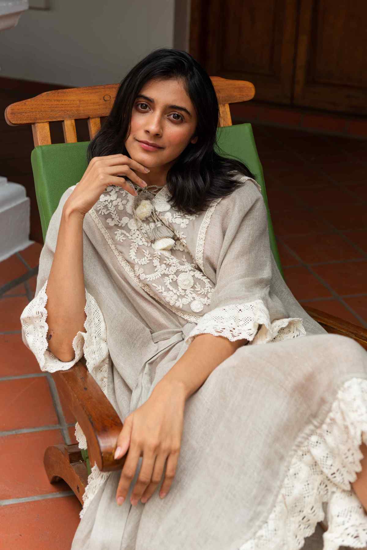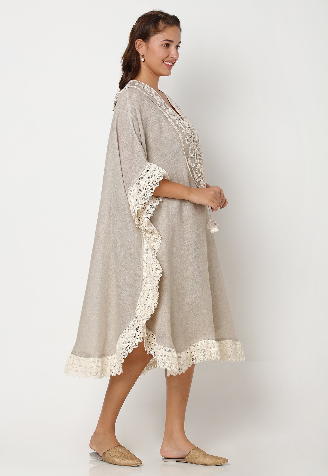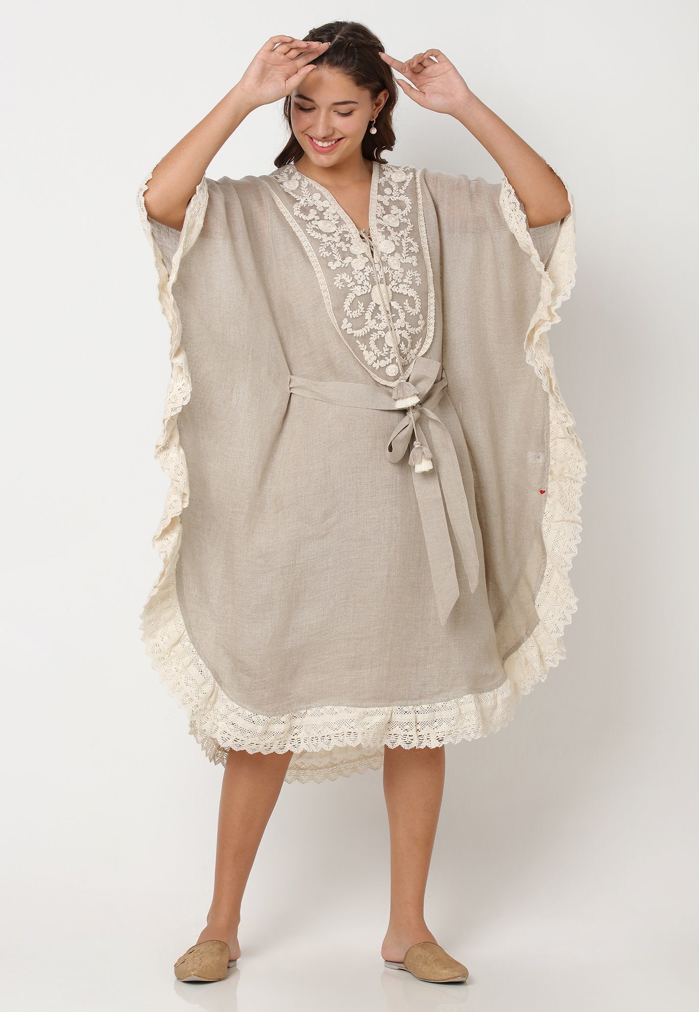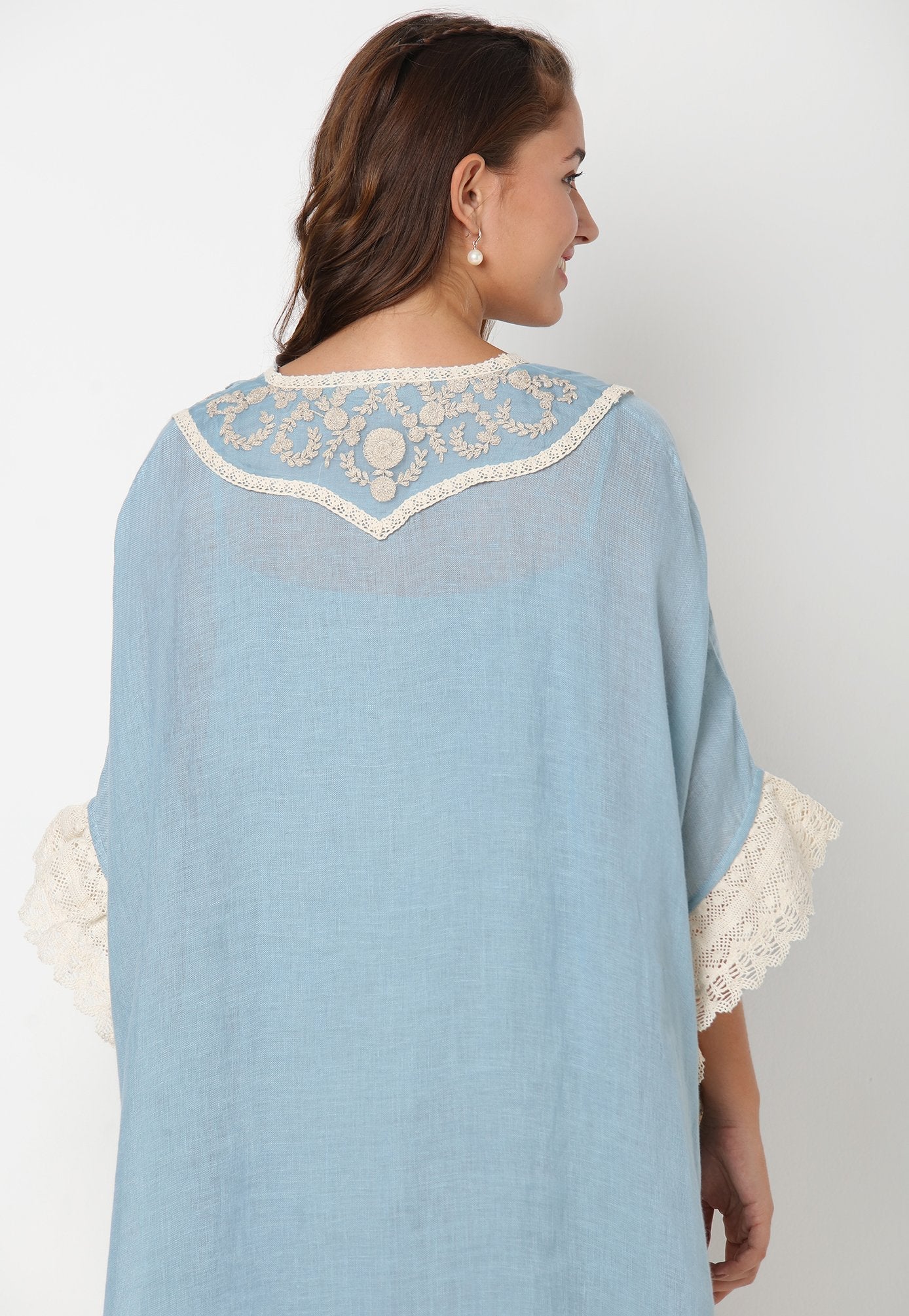This fun and flirty poncho dress is dressy, comfortable, elegant and fun all at the same time! Garlands and halos of detailed and thickly embroidered thread flowers embellish the front and back yokes with a tie-up at the neckline. Ruffled crochet laces all along the circular hem make this dress simply adorable and glorious.