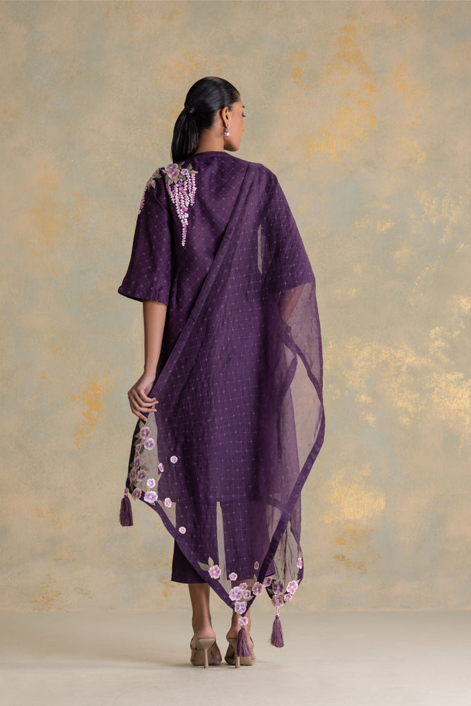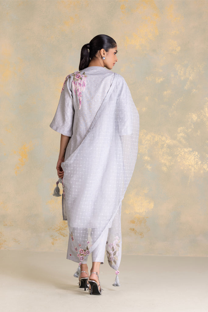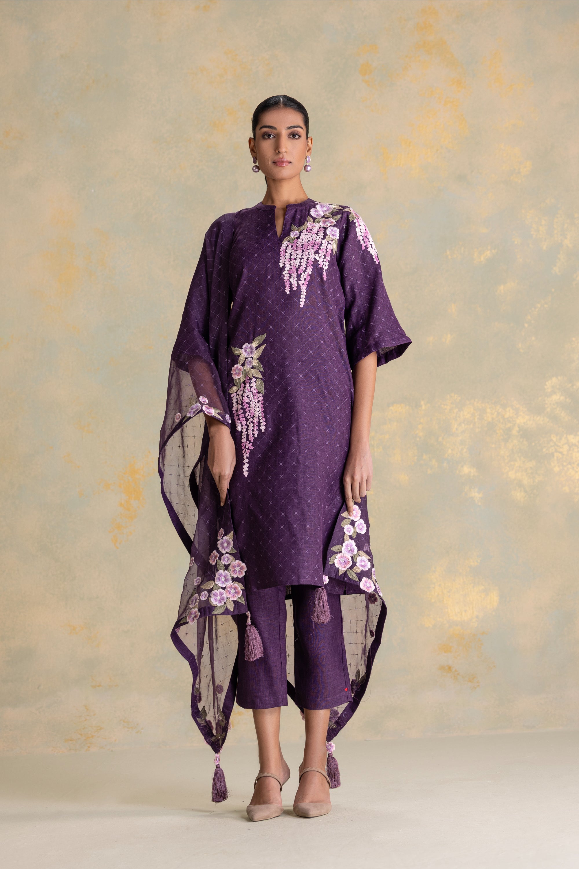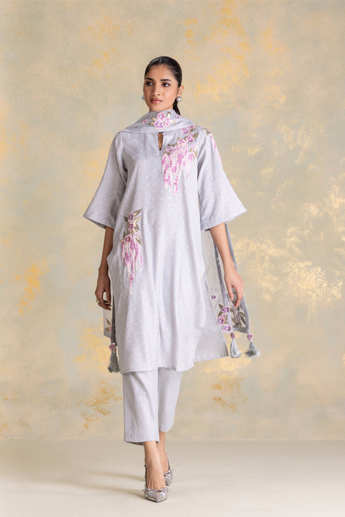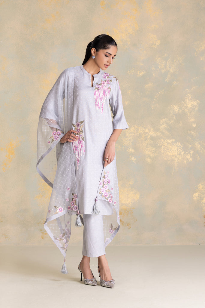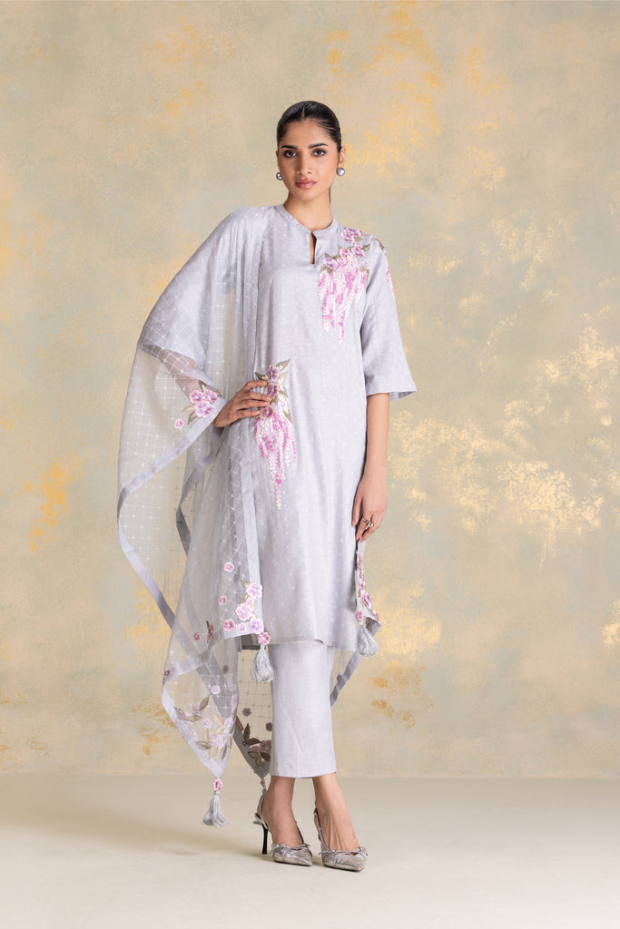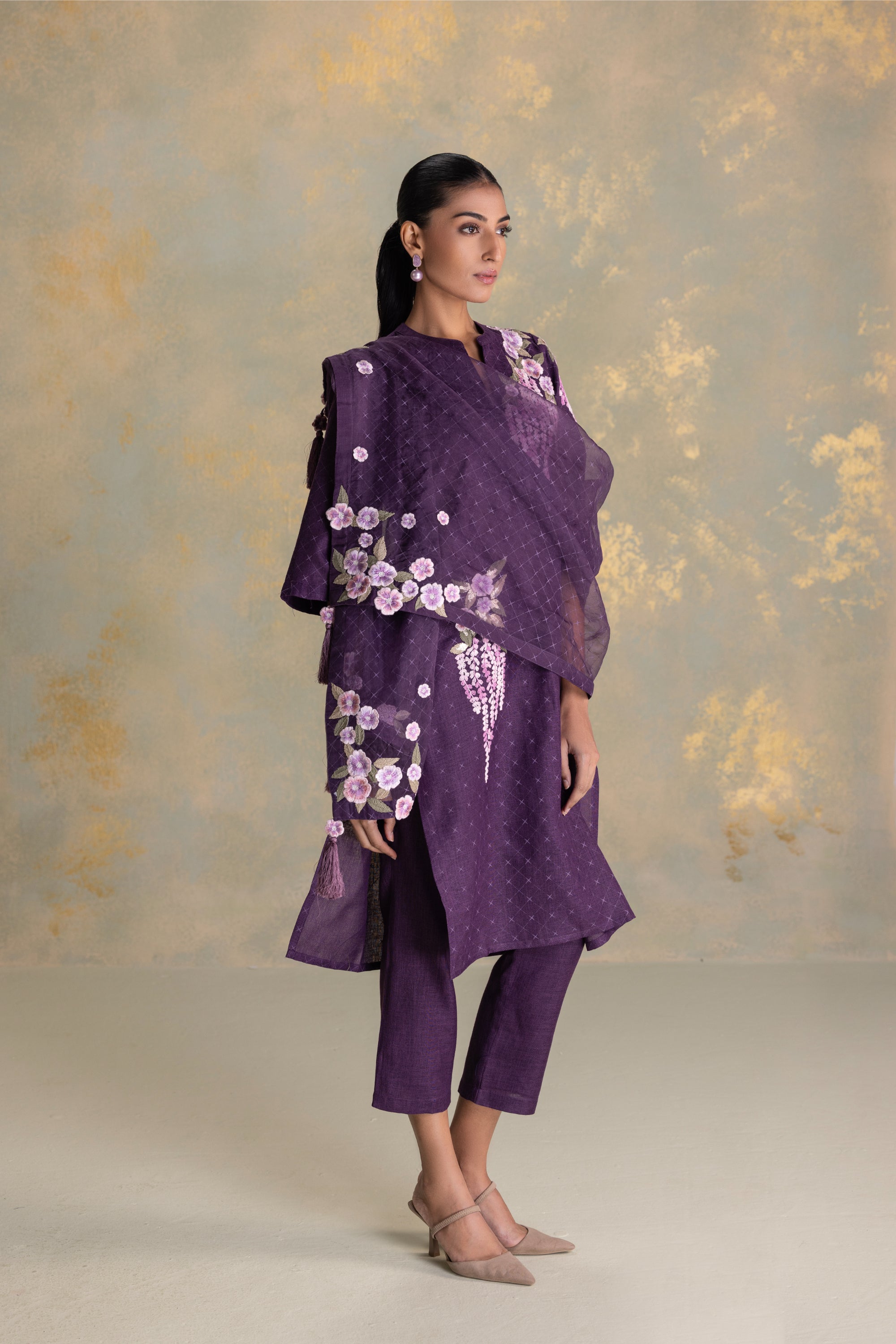 • Kurta with a Mandarin collar and 3/4 sleeves, designed in a fit-and-flare silhouette that combines structure with fluid ease. Paired with bell-bottom pants and a dupatta featuring delicate printing and 3D flowers with leaf detailing, it reflects the refined craftsmanship of the collection.