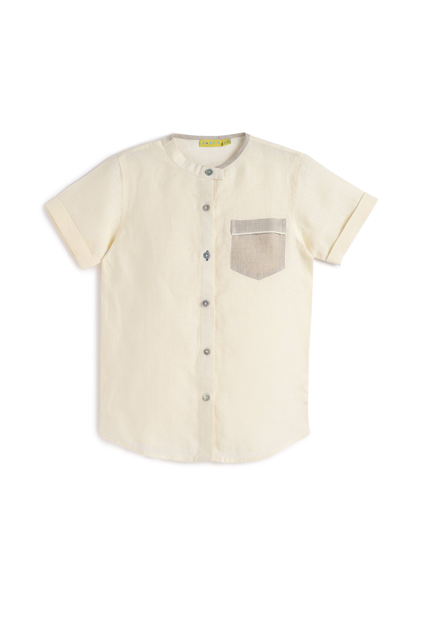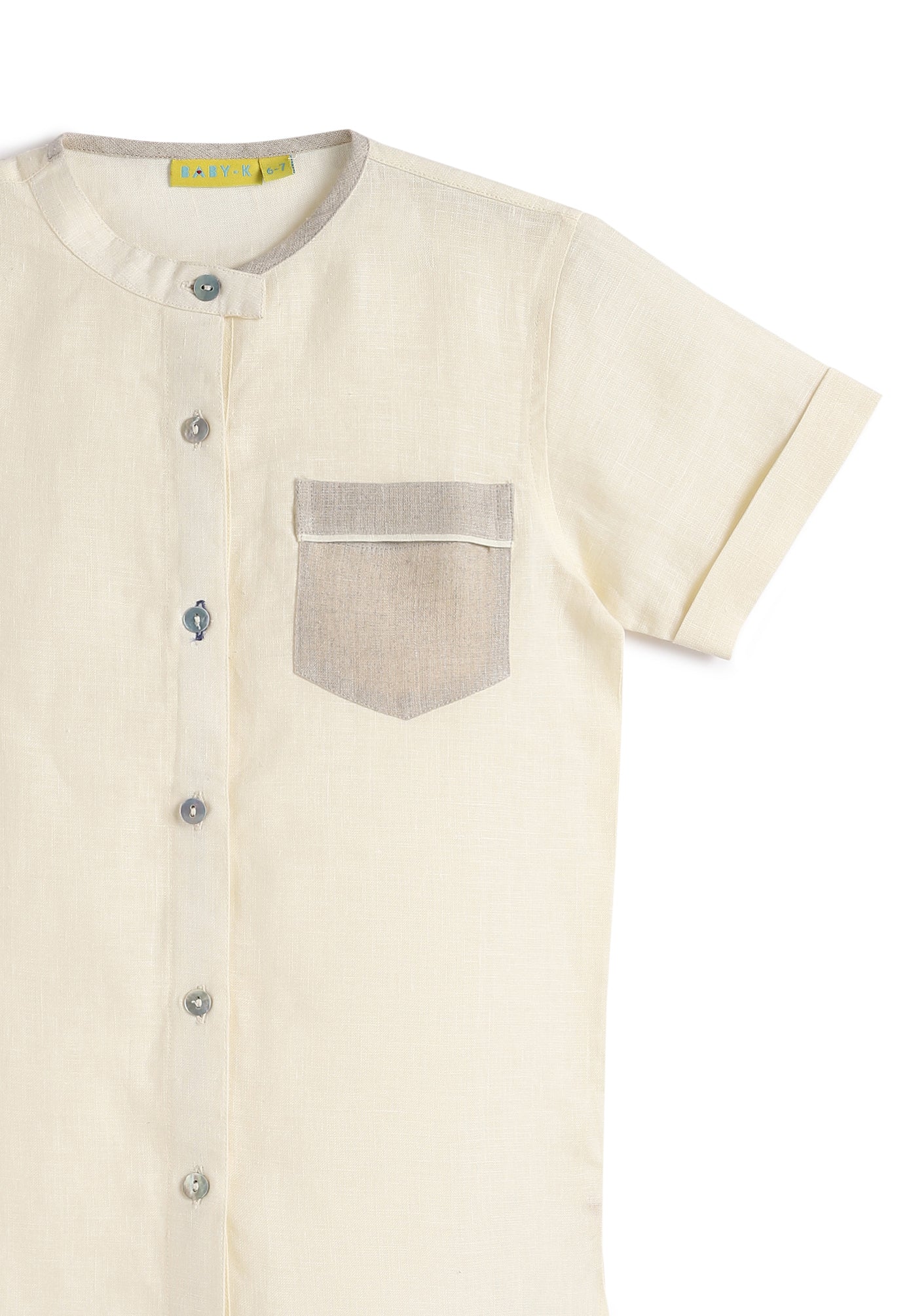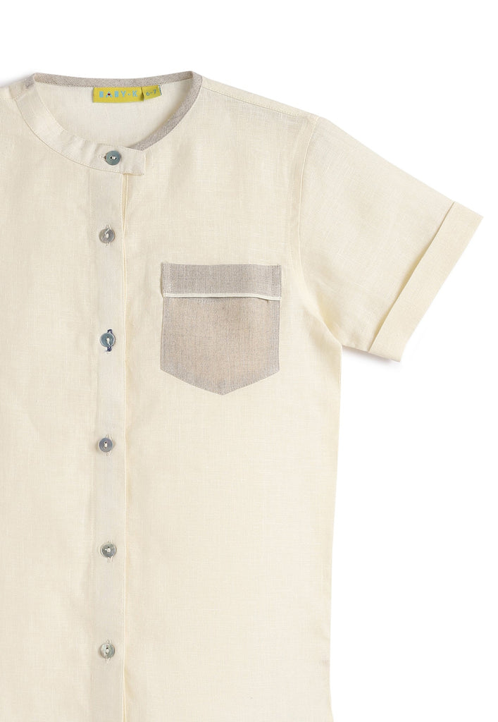 Short sleeve round neck shirt with a contrast pocket and interesting detailing, paired with adorable and comfy pants with elastic at the leg.